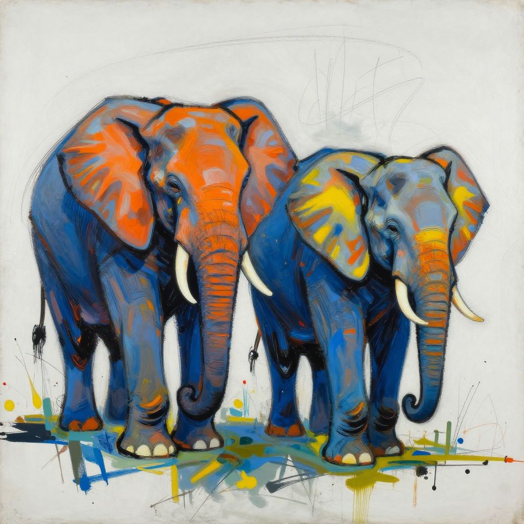 Vibrant digital painting of two elephants with blue, orange, and yellow patterns, standing side by side on a white background.