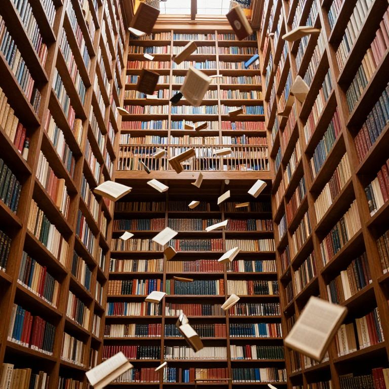 Books cascade through the air in a grand library, their pages fluttering as they drift between towering wooden shelves, creating a mesmerizing dance of knowledge and imagination.