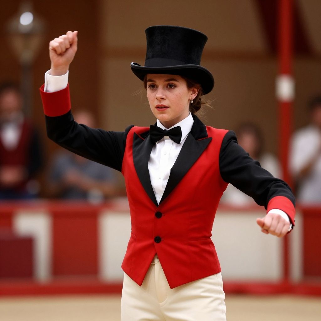 DEN_maia_serena, (performing in a (circus:1.2) wearing a red and black (blazer:1.1) and white (shirt:1.1) and cream (trousers:1.1) and black bow tie and (top hat:1.1), ring leader, circus:1.2), bokeh, f1.4, 40mm, photorealistic, raw, 8k, textured skin, skin pores