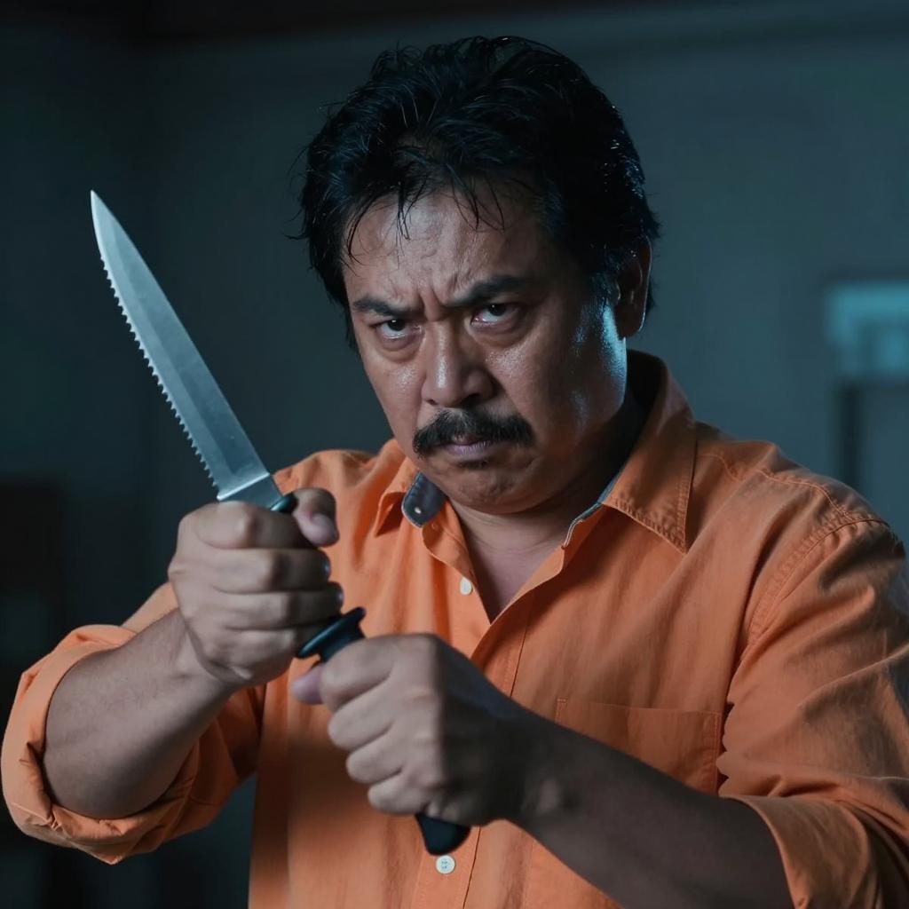 Photograph of a middle-aged man with dark hair and a mustache, wearing an orange shirt, gripping a serrated knife. He has a tense, intense expression, illuminated by harsh blue light from the right. Dark, shadowy background. Foreground knife blade in sharp focus.