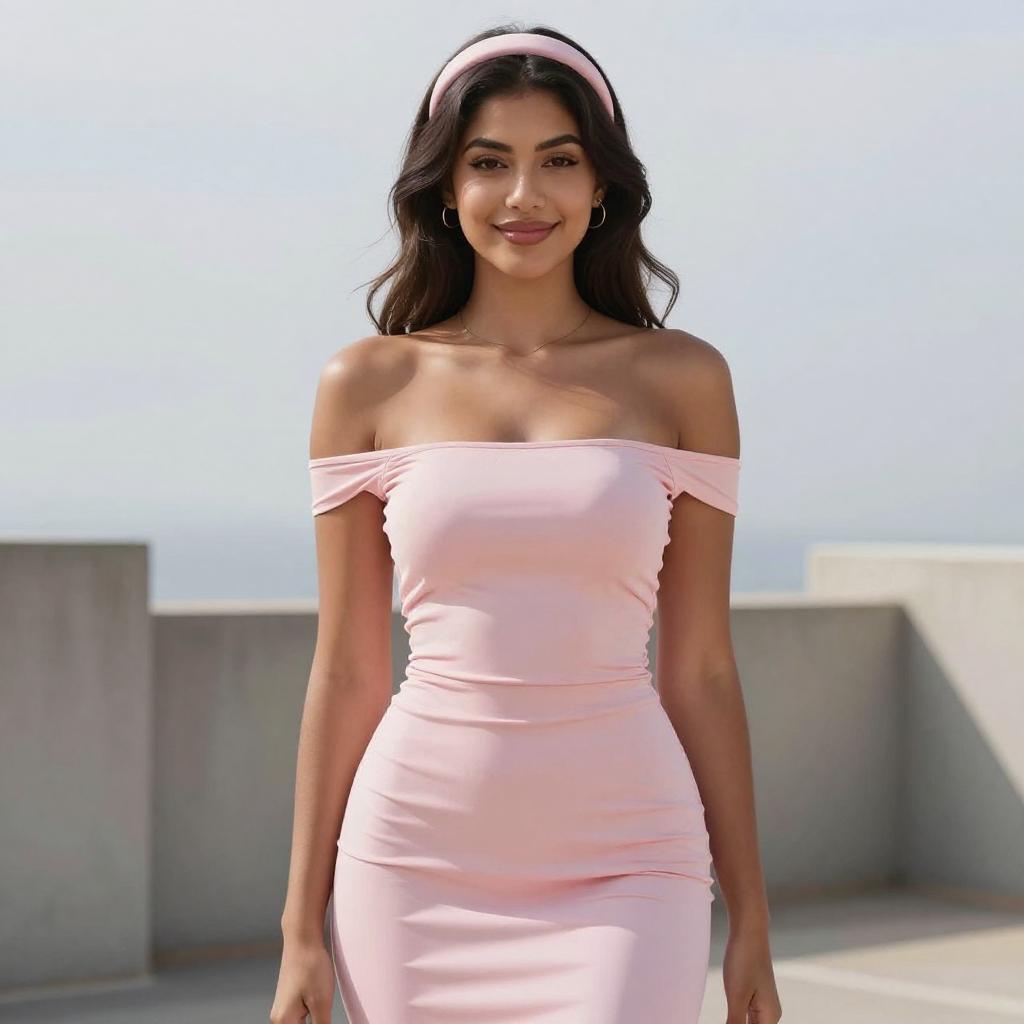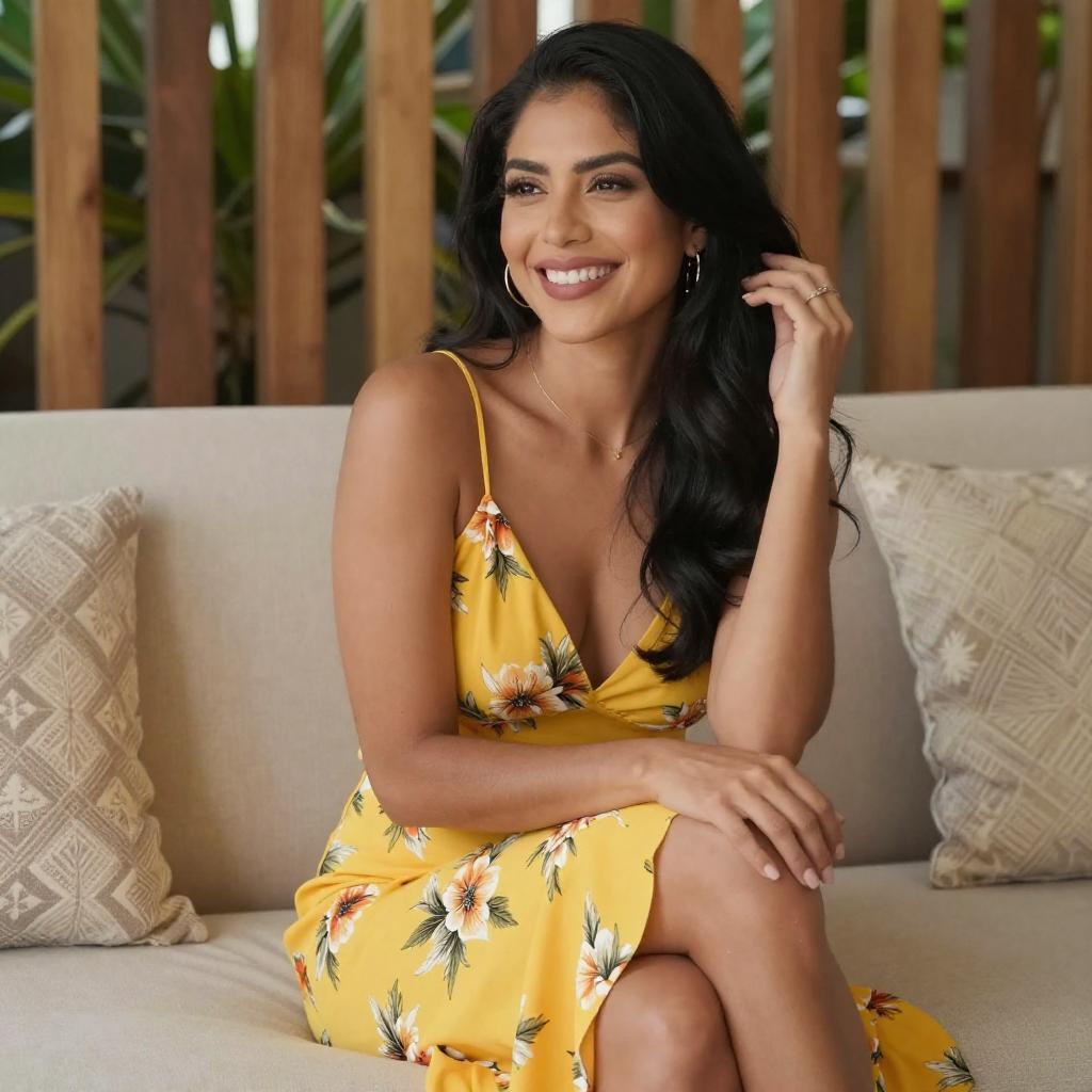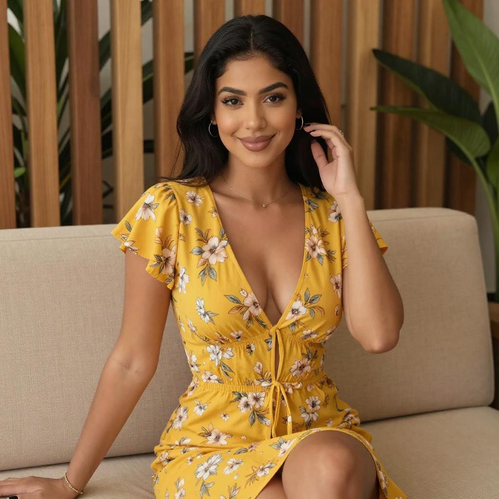Photograph of a young woman with medium skin tone and black hair, sitting on a beige couch. She wears a yellow, floral-patterned, short-sleeved dress with a deep V-neck, revealing moderate cleavage. She smiles, with one hand touching her hair. The background features wooden slats and green plants. She has black nail polish and a bracelet on her right wrist.