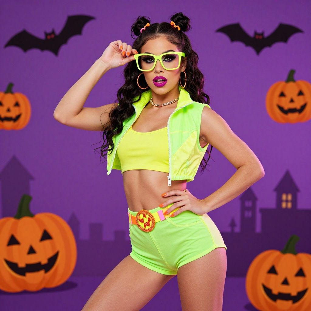 Abby Lee Miller Halloween costume, retro 1980s dance instructor vibe, neon colors, oversized glasses, bold makeup, vibrant background with Halloween pumpkins and bats, stylized illustration, dynamic and confident stance, festive party scene