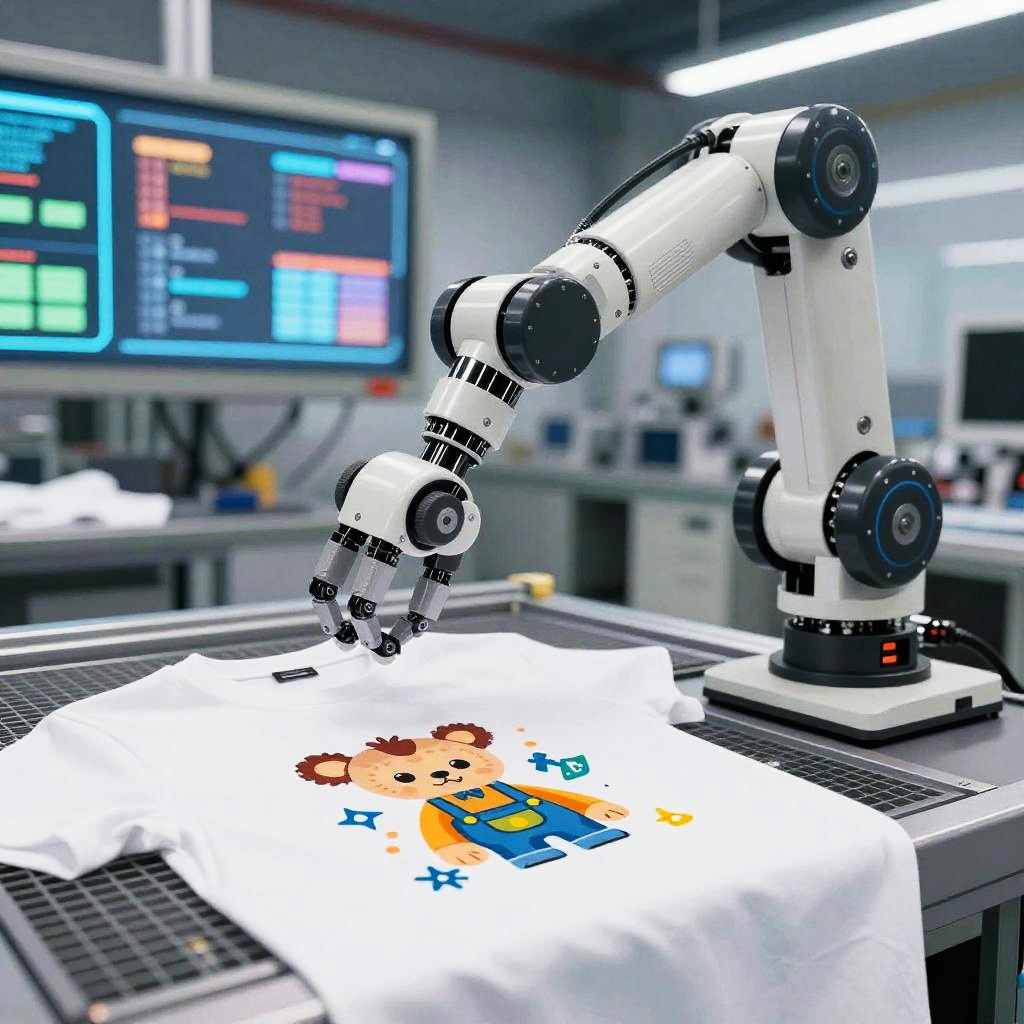 AI t-shirt generator in action, a robotic arm selecting and printing innovative graphic designs on t-shirts, hyper-realistic style, bright lighting, futuristic factory background with digital panels, emphasizing cutting-edge technology and creativity synergy