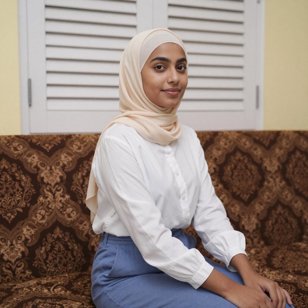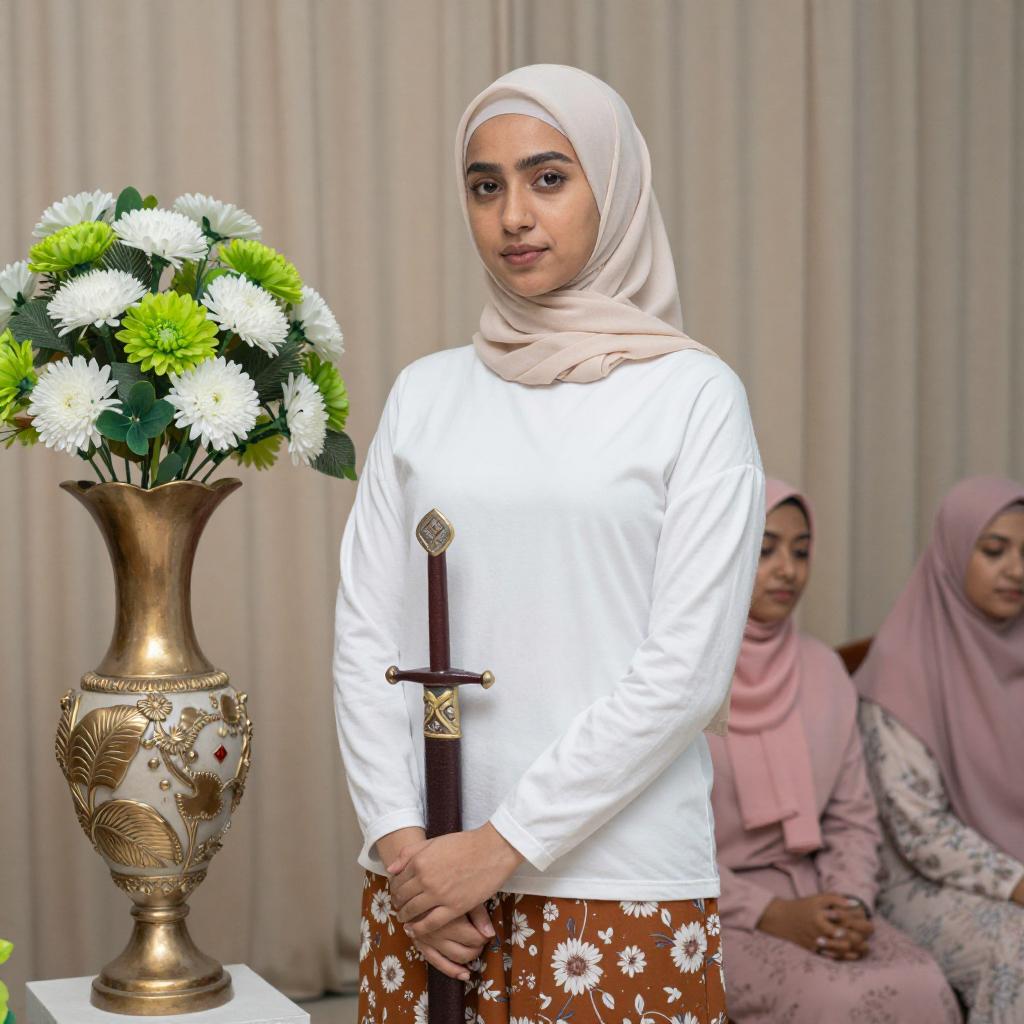 Photograph of a young woman with light brown skin and dark eyes, wearing a beige hijab, white long-sleeve top, and brown floral pants. She stands holding a brown ceremonial sword, next to a tall, ornate vase with white and green flowers. Background includes beige curtains and seated women in pink hijabs.