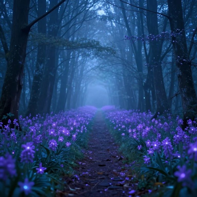 Magical forest path bathed in blue light, lined with glowing purple flowers, surrounded by towering, misty trees in a dreamy, ethereal