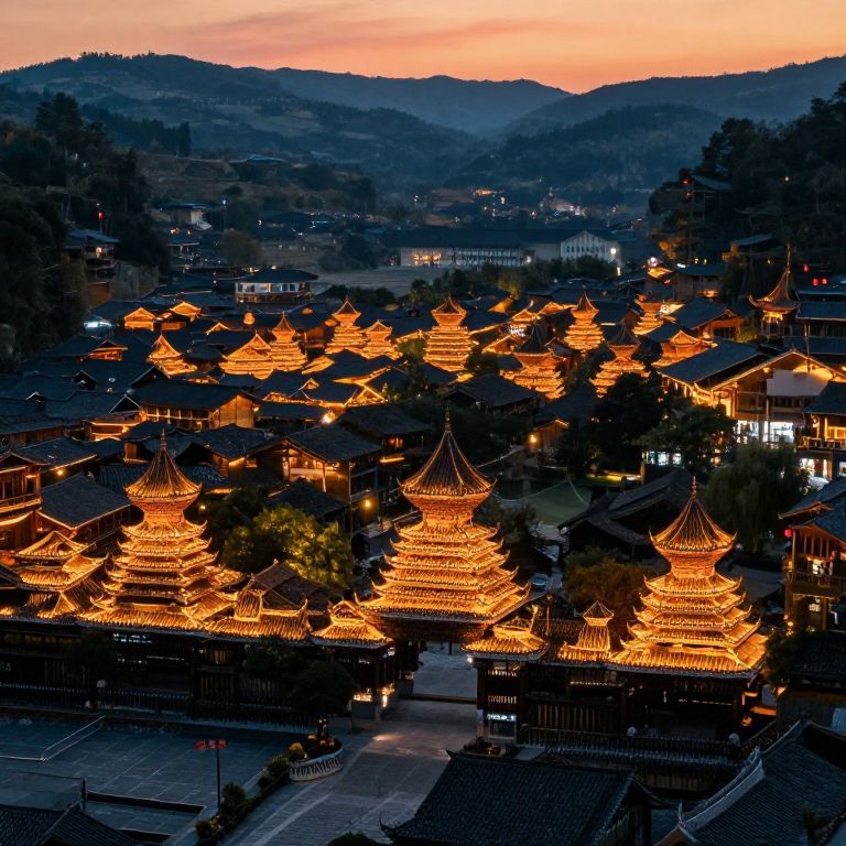 Photograph of a traditional Asian village at dusk, featuring multiple brightly-lit, ornate pagodas with golden-yellow, intricate roof details. The village is nestled in a hilly landscape, with dark, shadowy buildings and trees surrounding the illuminated pagodas. The sky is a gradient of orange and pink, transitioning to deep blue as night approaches. Streetlights and smaller house lights add to the warm glow, creating a contrast between the illuminated structures and the darkening surroundings. The image captures a serene, yet vibrant atmosphere, highlighting the cultural and architectural beauty of the village.