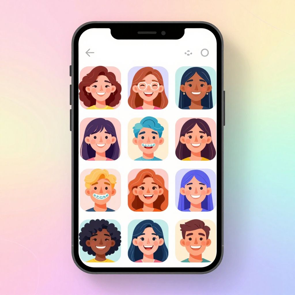 Braces filter online free, animated mobile app screen displaying various colorful braces options over diverse smiling faces, trendy and youthful vibe, bright pastel color palette, smooth gradients, engaging and interactive digital experience illustration.