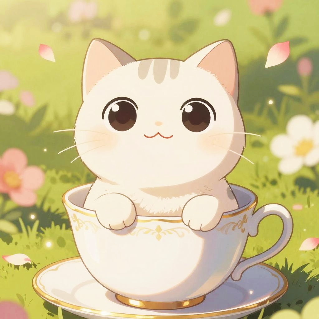 Anime cats cute, a single chubby anime cat with oversized eyes and a tiny pink nose, sitting inside a cozy teacup surrounded by floating flower petals, vibrant colors, whimsical background with soft bokeh effect, highly detailed and heartwarming