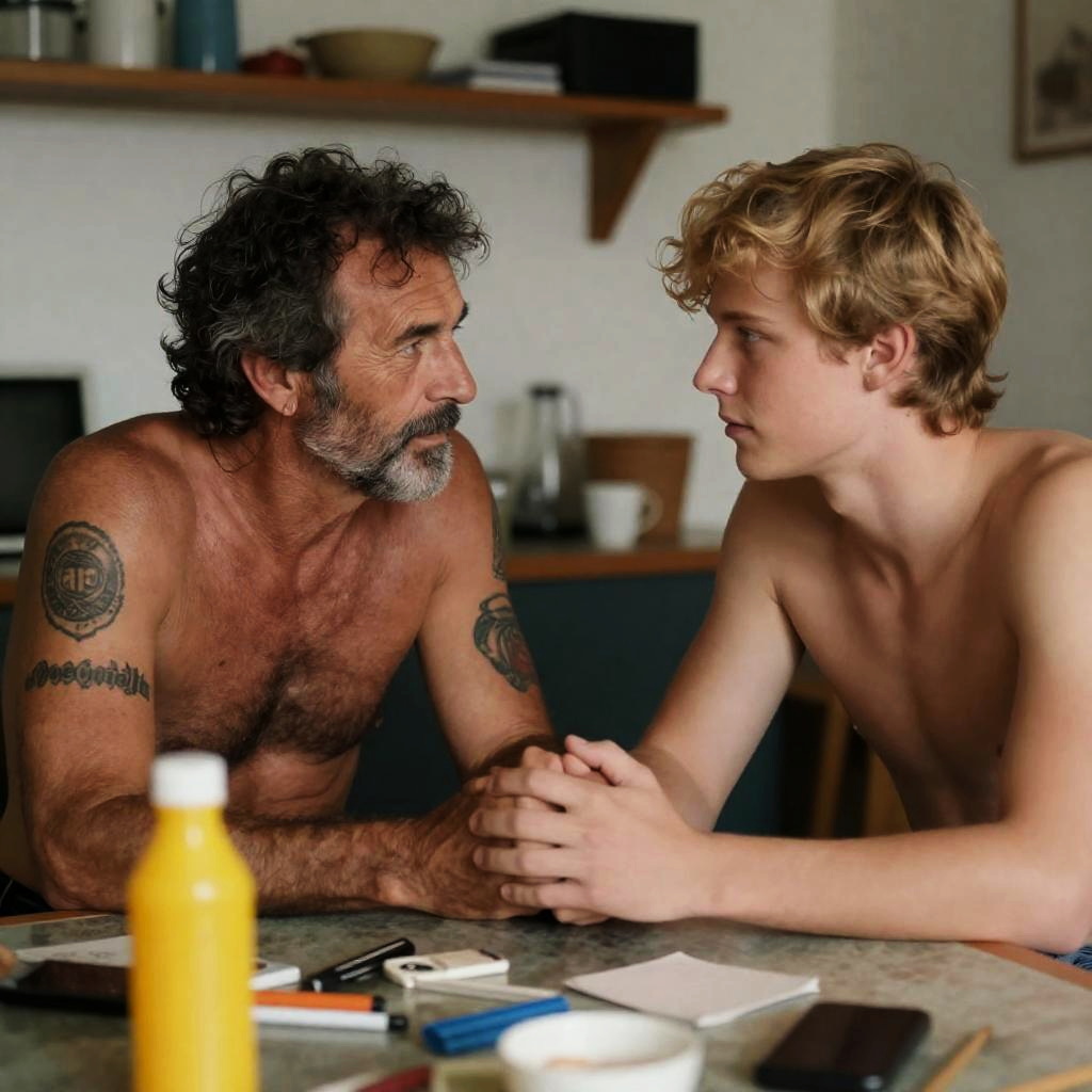 Two men on a black leather couch. Shirtless young man with light skin, short brown hair, and a muscular build reclines, wearing beige shorts. Older man with dark hair, wearing a patterned shirt, leans close, right arm resting on the backrest. Dimly lit room with a door in the background. Young man looks slightly up at the older man.