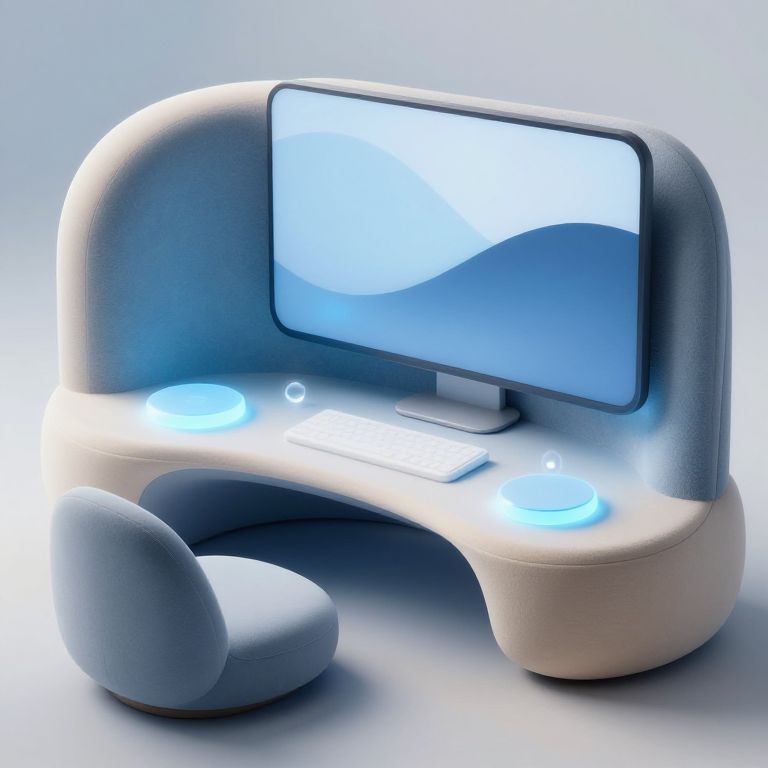 What is comfy UI interpreted as an ergonomic digital workspace, with plush cushions, organic shapes, calming blue and beige tones, interactive touch elements glowing softly, sleek and tactile display resembling soft fabrics, blending technology and comfort seamlessly.