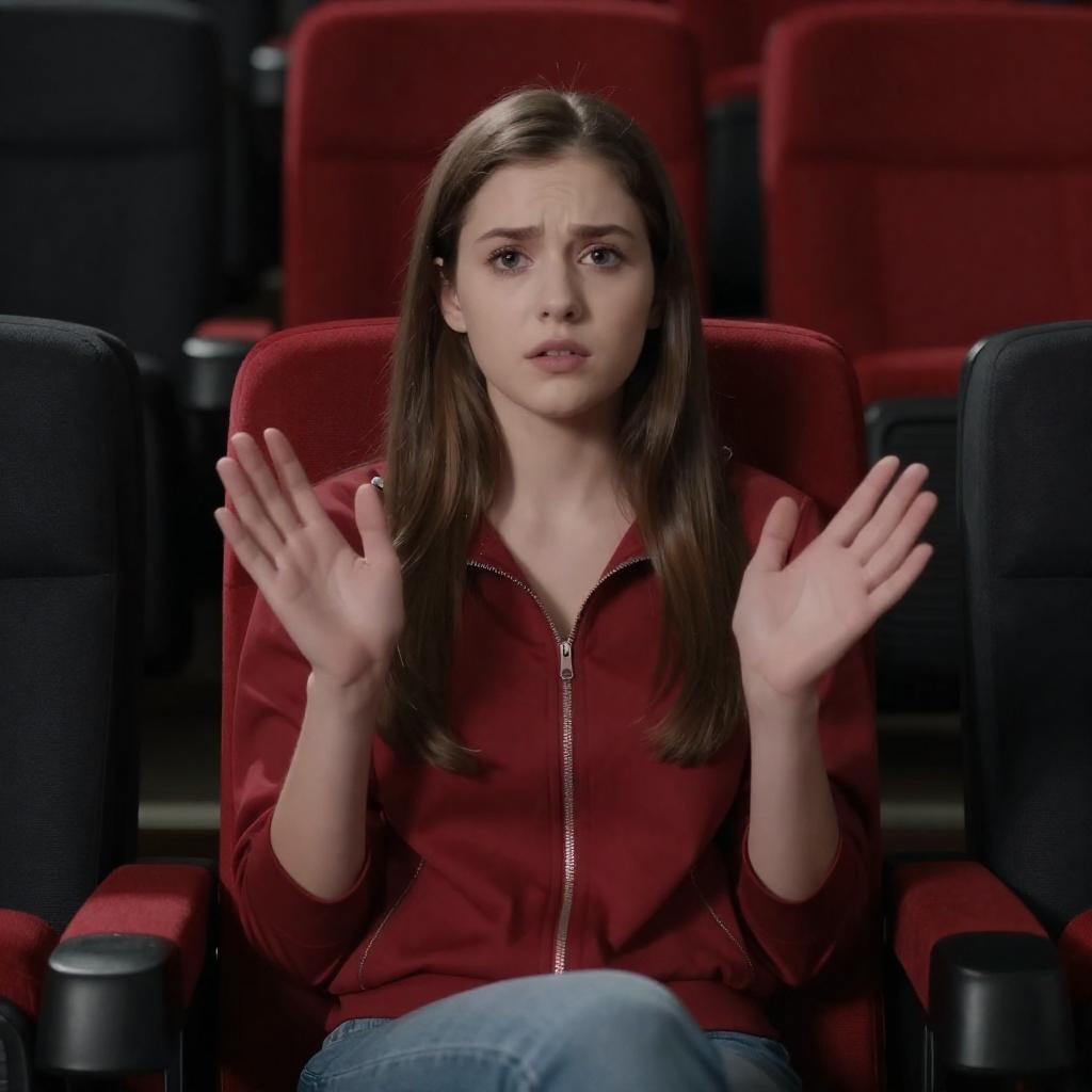 Photograph of a young woman with long brown hair and fair skin, wearing a red jacket, sitting in a red and black movie theater seat. She has a concerned expression, with both hands raised near her chest. The background shows more red and black seats.