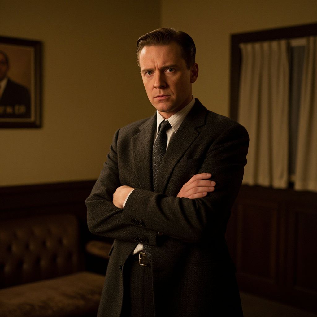 A man stands confidently in a dimly lit room, with his arms crossed, showcasing a scene reminiscent of classic film noir. The room's vintage decor and the man's serious expression add to the cinematic atmosphere captured in this striking photo.