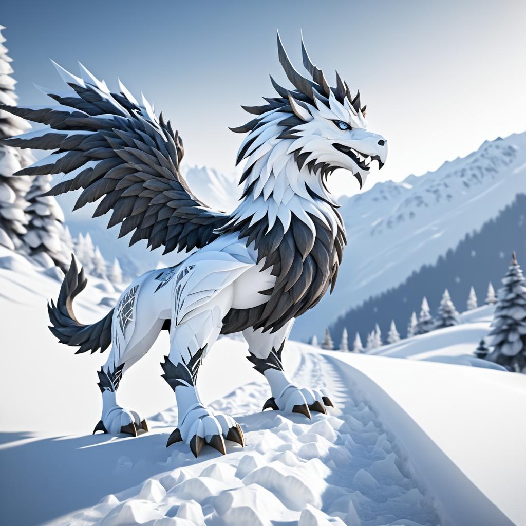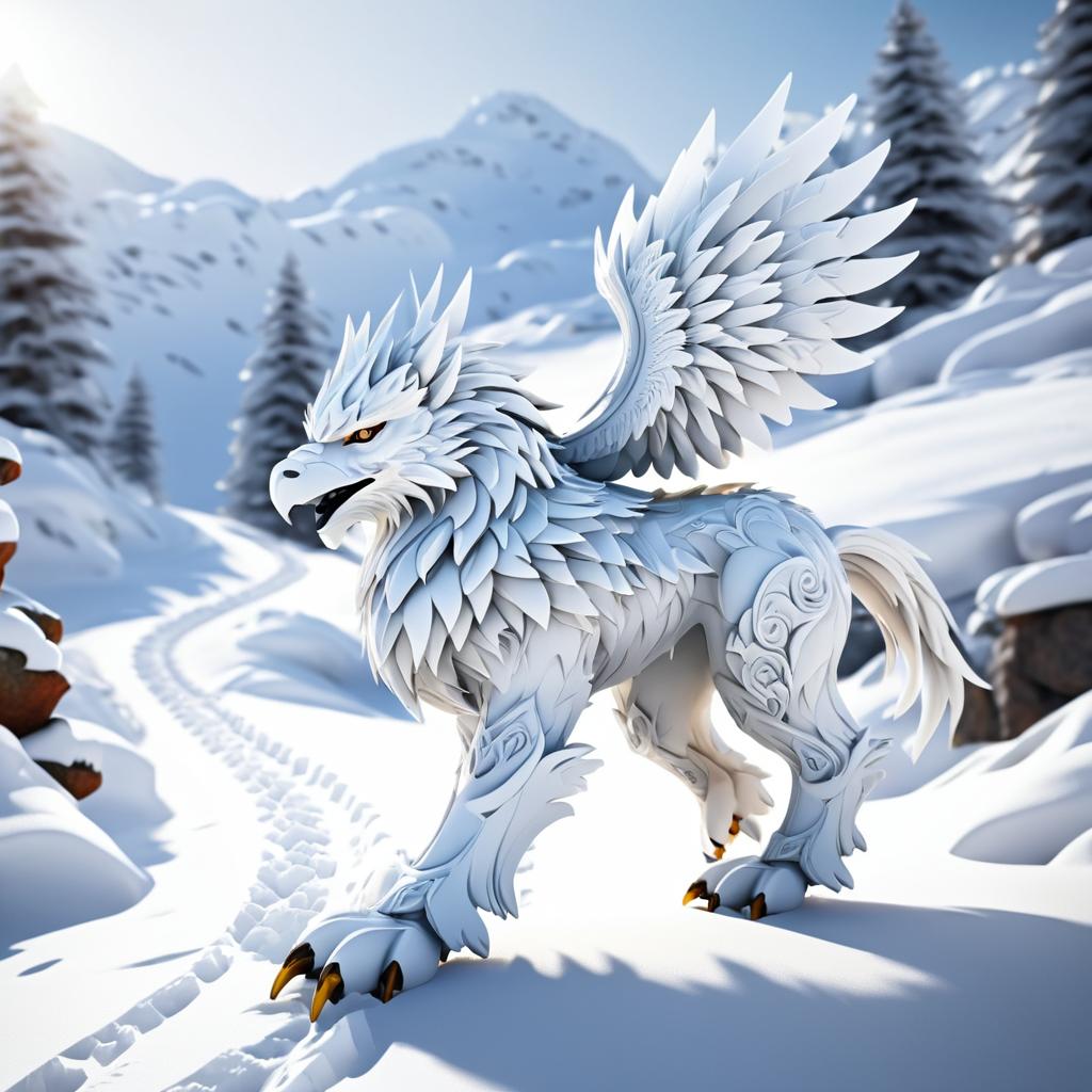 A snow griffin on a path in snowy mountains, rendered with ultra-realistic graphics, octane render, depth of field, highly detailed and cinematic.