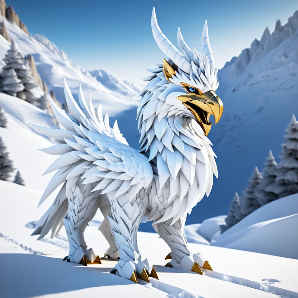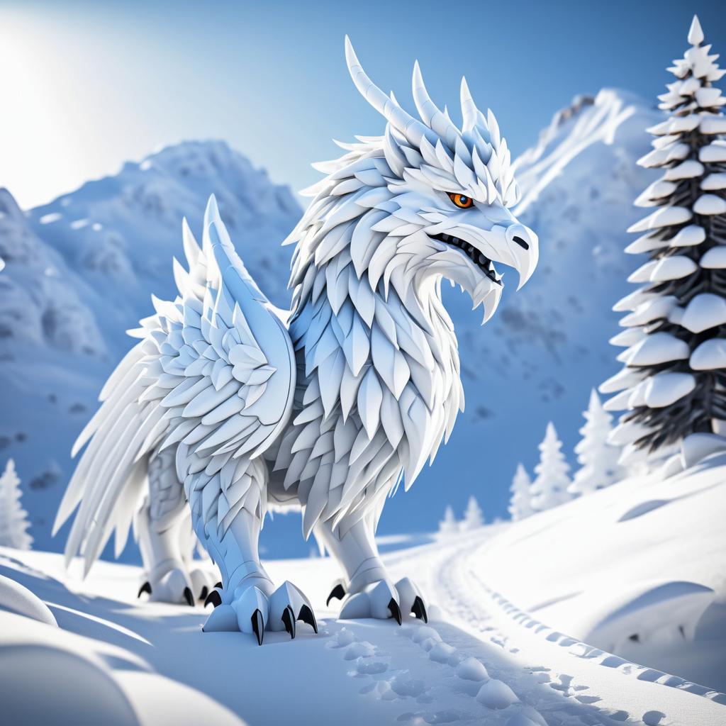 Ultra-realistic 3D rendering of a majestic white snow griffin standing on a stone path surrounded by snow-covered pine trees and mountains. The griffin features detailed feather-like armor, golden claws, and a fierce expression with sharp teeth and amber eyes, showcasing a highly detailed and cinematic depth of field effect.