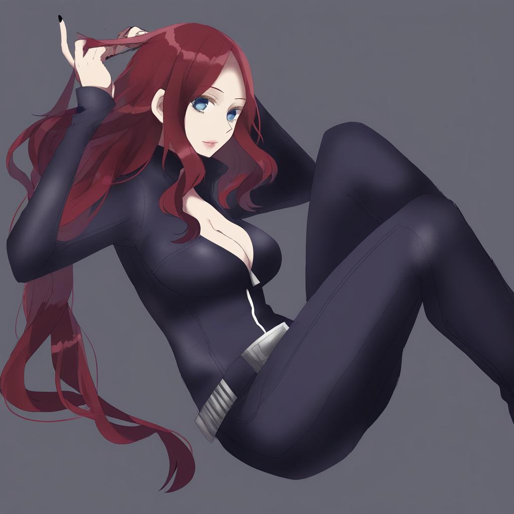 Digital anime-style illustration of a young woman with long red hair and blue eyes wearing a tight black bodysuit with a belt. The character displays a confident pose with hands adjusting her hair, emphasizing her cleavage and medium to large breasts. The background is plain gray, highlighting the character's detailed features and outfit.