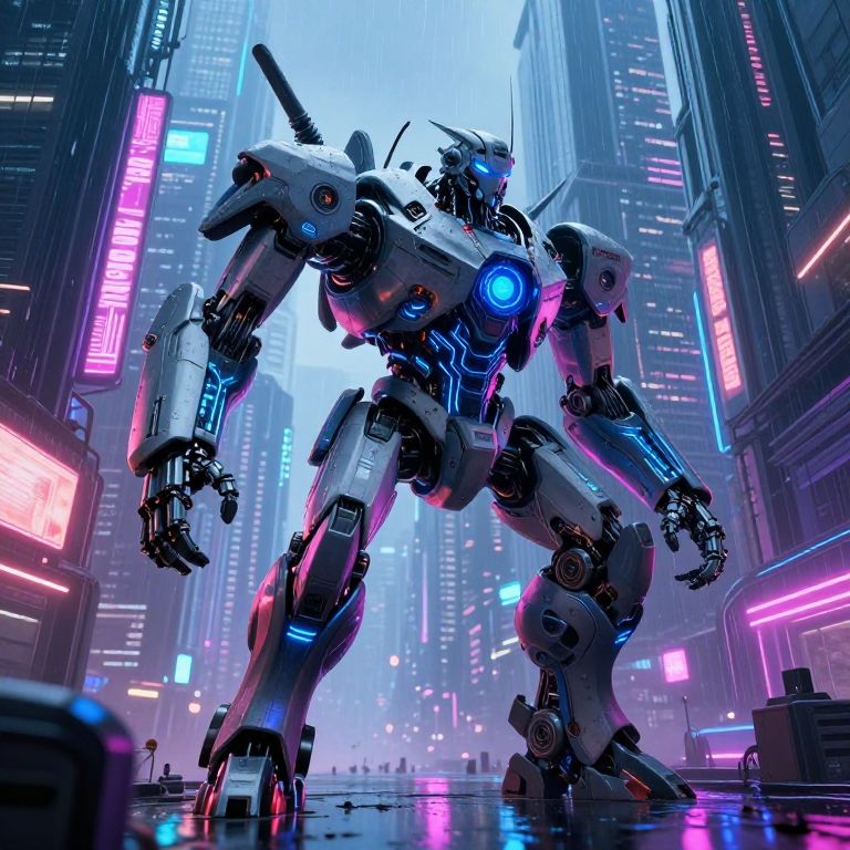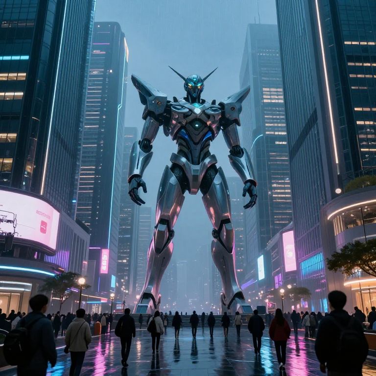 Photorealistic digital artwork depicting a towering, futuristic mecha standing in the center of a bustling urban street at night. The mecha, with sleek metallic armor and glowing blue accents, dominates the scene, flanked by tall, illuminated skyscrapers. A crowd of silhouetted people walks below, with neon signs and digital billboards in vibrant colors (pink, blue, white) lining the street. The wet pavement reflects the mecha and lights, adding a sense of depth and realism. The sky is a misty blue, enhancing the sci-fi atmosphere. The artwork combines elements of realism and fantasy, creating a striking, futuristic cityscape.