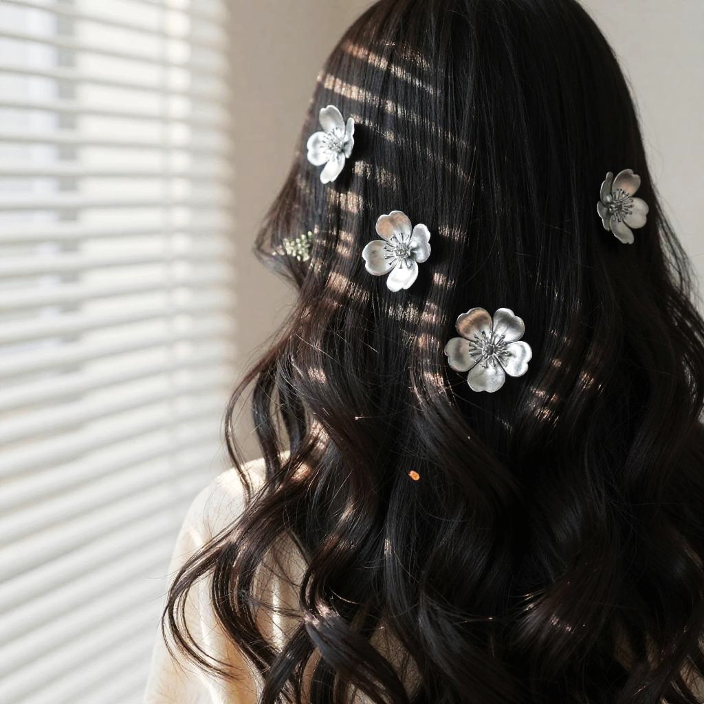 Close-up of black long wavy hair adorned with delicate silver flowers, soft sunlight filtering through window blinds, ultra-realistic detailing on every strand, radiant waves with subtle highlights, gentle freshness and peaceful indoor ambiance