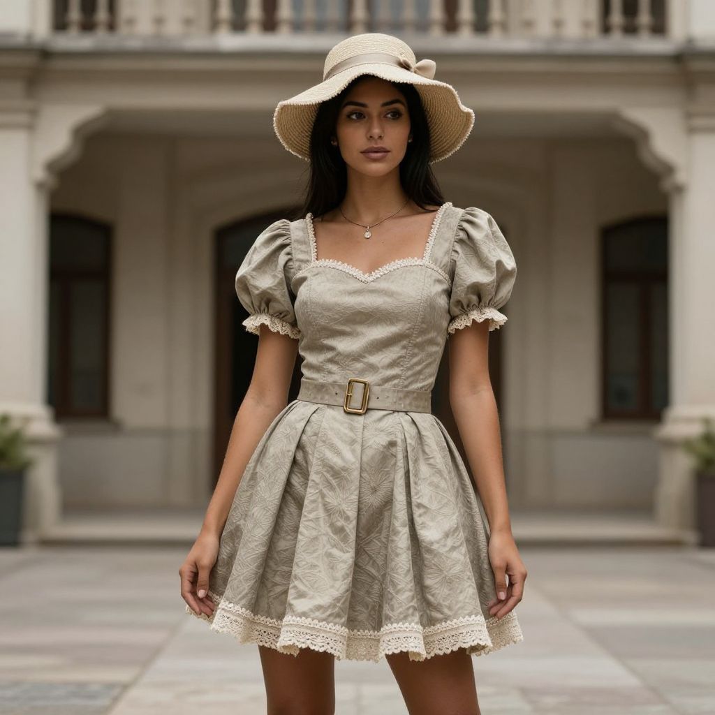 Photograph of a young woman with long black hair, light brown skin, and a slender build, standing in front of an ornate, classical-style building. She wears a beige, short-sleeved, puffed-sleeve dress with white lace trim and a wide belt with a gold buckle, paired with a matching wide-brimmed hat. The dress has a square neckline and the fabric has a subtle floral pattern. She stands with a confident posture, looking directly at the camera. The background features a stone courtyard with potted plants and tall windows. The overall style is elegant and vintage.