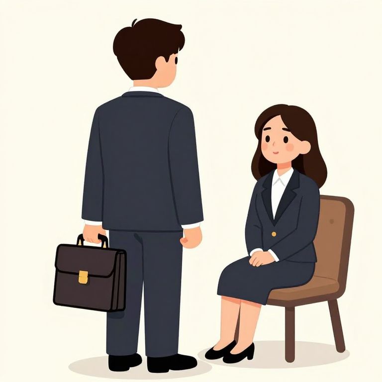 Digital illustration of a man in a dark suit standing with a briefcase, facing a seated woman in a matching suit and black heels, on a plain