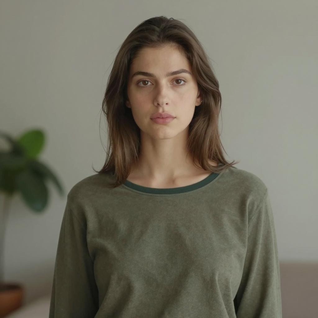 Photorealistic portrait of a young woman with long wavy brown hair wearing a sleeveless red polka dot dress tied at the waist. She has a neutral expression, large hoop earrings, and a delicate necklace. The indoor setting includes a potted plant on the left and a framed painting on the wall behind her. The natural light illuminates the casual daytime environment.