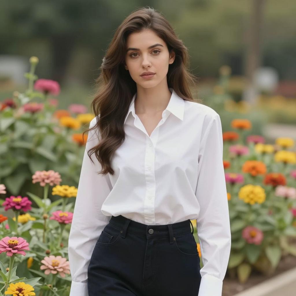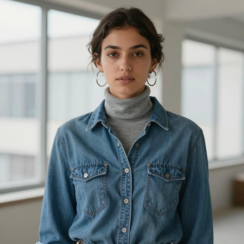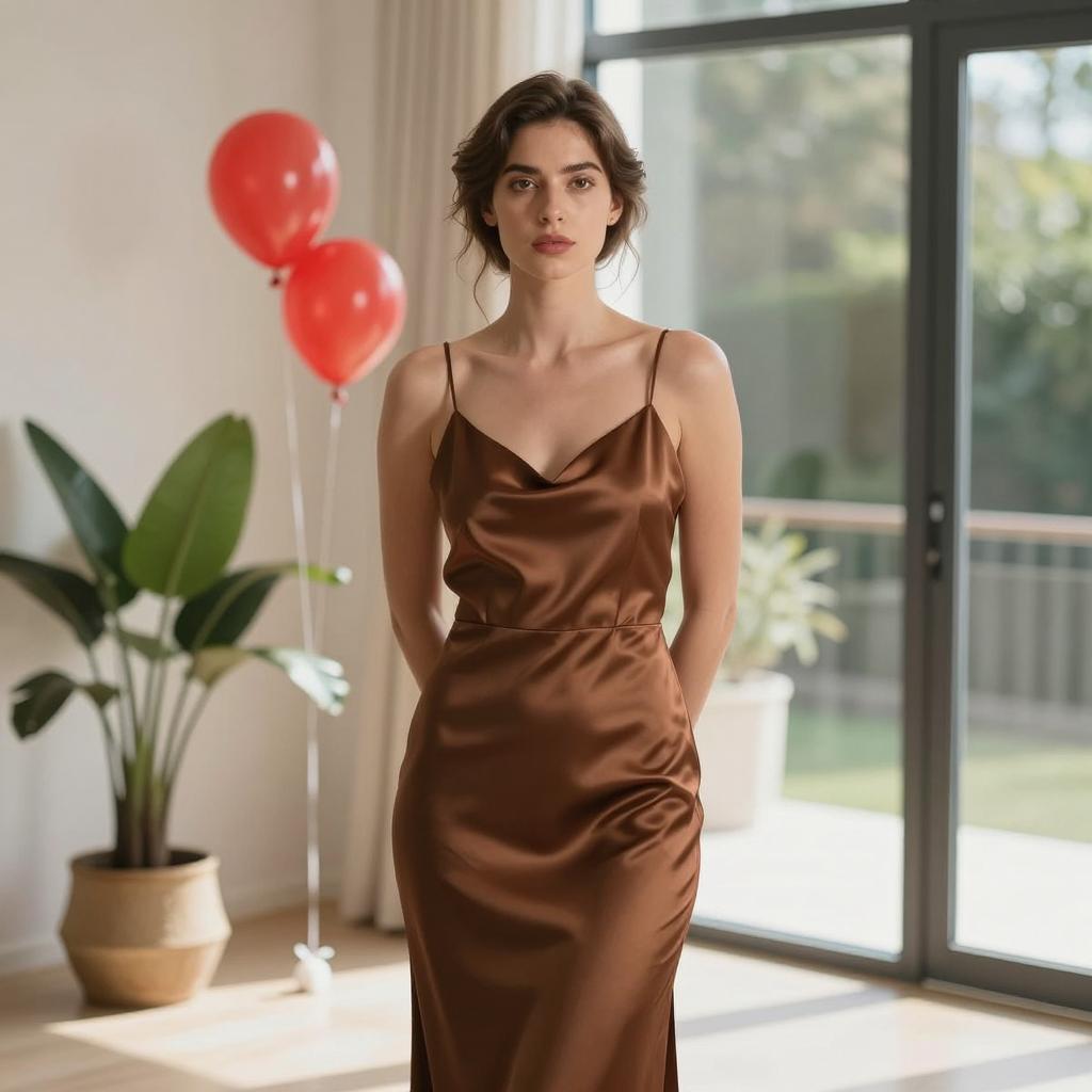 Casual birthday dress woman, photorealistic portrait of young woman, brown hair, long wavy, wearing red polka dot dress, sleeveless, tied at waist, small breasts, standing, neutral expression, natural light, indoor background, potted plant on left, framed painting on wall, large hoop earrings, casual setting, daytime, medium shot, focused on face