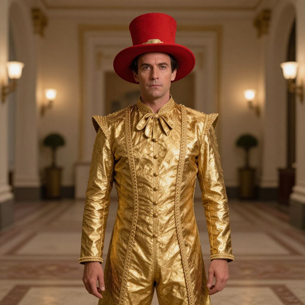 Magic Ball Costume, man in a red hat and gold outfit standing in a hall