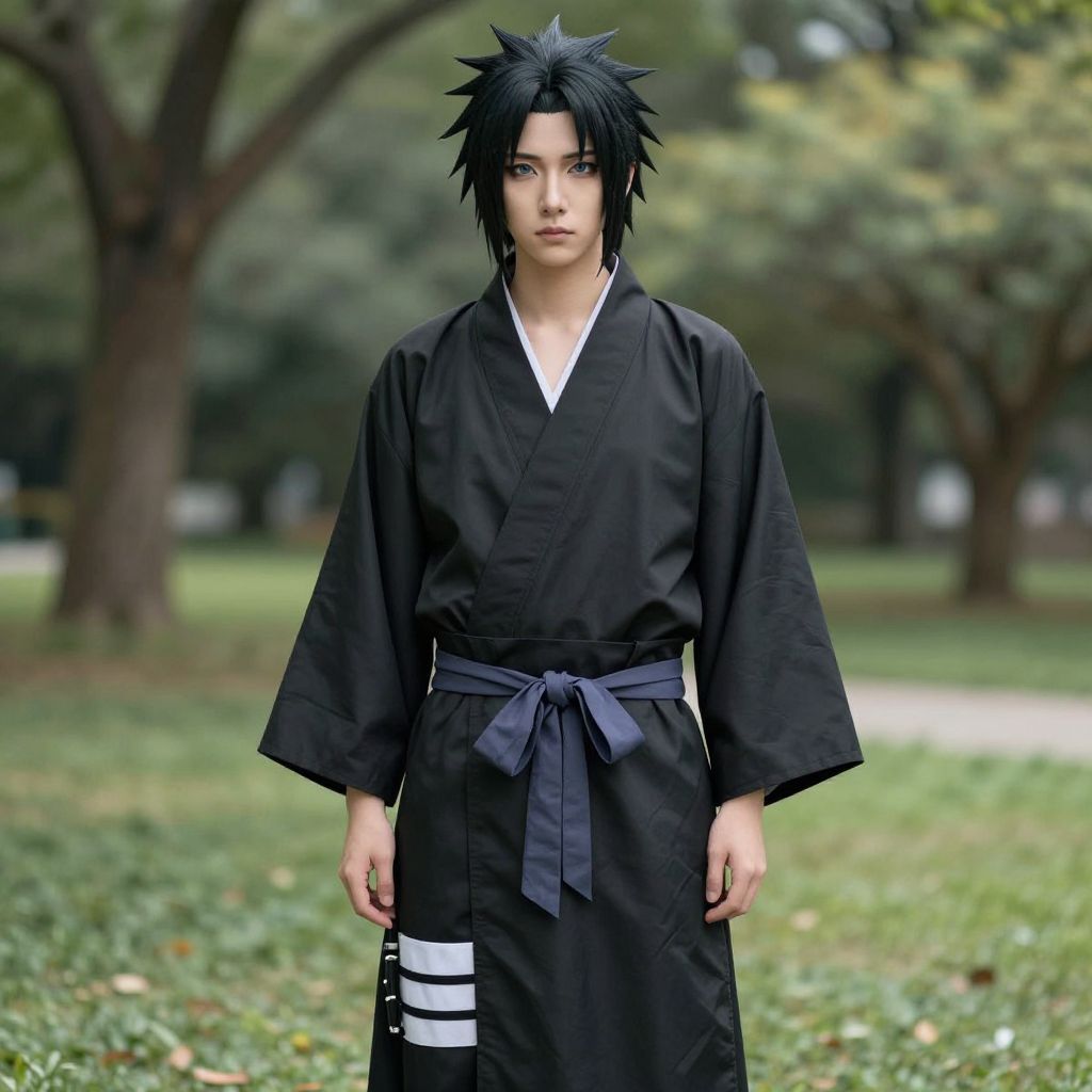 Young adult male dressed in a black Sasuke Uchiha cosplay robe with a blue waist sash, standing outdoors in a park. The costume features traditional anime-inspired styling, including a distinctive black wig styled with spiky hair. The background is a blurred natural setting with trees and grass.