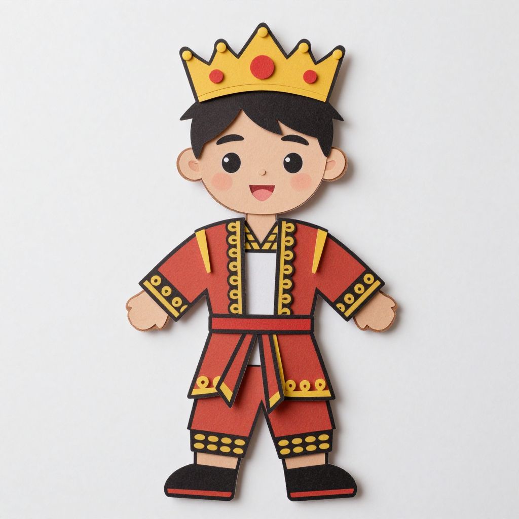 Sinulog Festival Paper Doll Costume, asian boy in traditional dress with a crown on his head