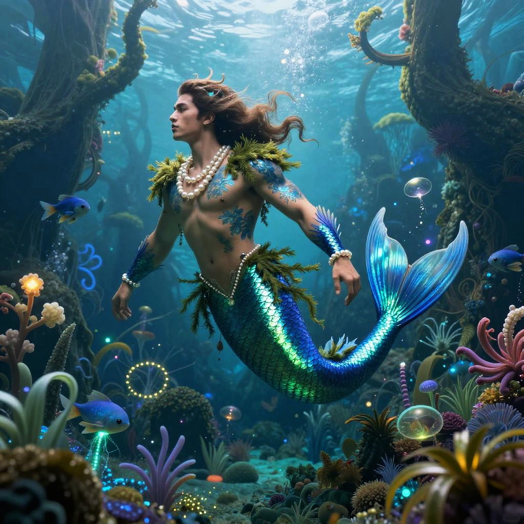 A male mermaid called a merman, painted with iridescent blue and green scales, sporting seaweed armor and pearl accessories, swimming through an enchanted underwater forest filled with glowing plants and mysterious sea creatures.