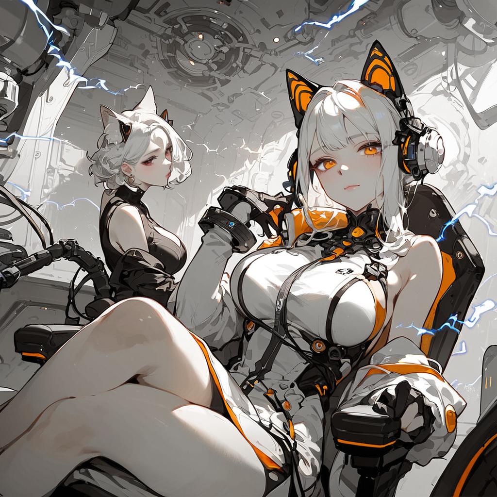 Score_9, score_8_up, score_7_up, source_anime, rating_explicit, best quality, masterpiece, uncensored, ultra detailed, 1girl, seductive smile, oiled_skin, cameltoe, blue eyes, brown hair, short hair, hoshino fumina, medium breasts, cat ears, gun, elbow gloves, bodysuit, covered navel, armor, bike shorts, skin tight, rifle, yellow shoulder armor, yellow waist armor, scenery, red theme, sign, neon lights, indoors, fence, couch, upper body