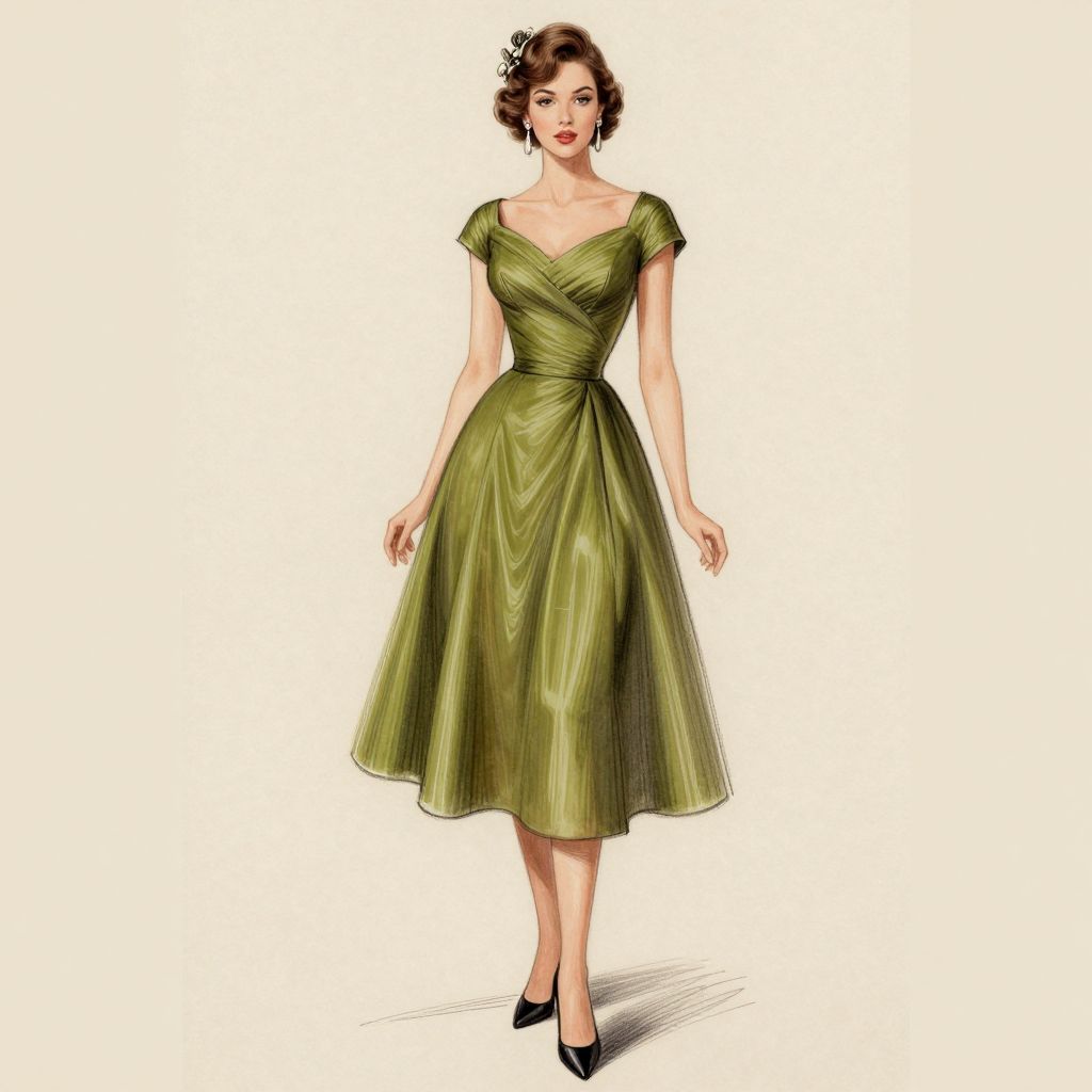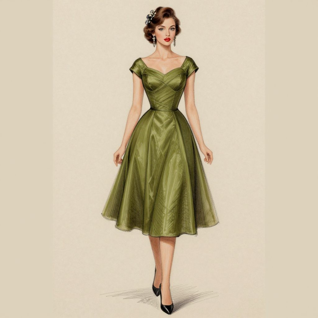 Elegant vintage fashion sketch featuring a woman in a knee-length olive-green dress with a fitted bodice, flared skirt, and black high heels, accessorized with dangling earrings and a floral hair accessory.