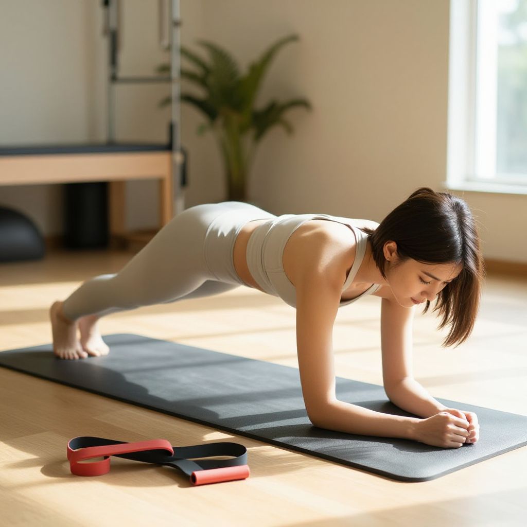 Young woman bending over in tight leggings, performing a stretch in a modern gym setting with sleek equipment, bright lighting highlighting the texture of her fabric and muscles, realistic and dynamic pose.