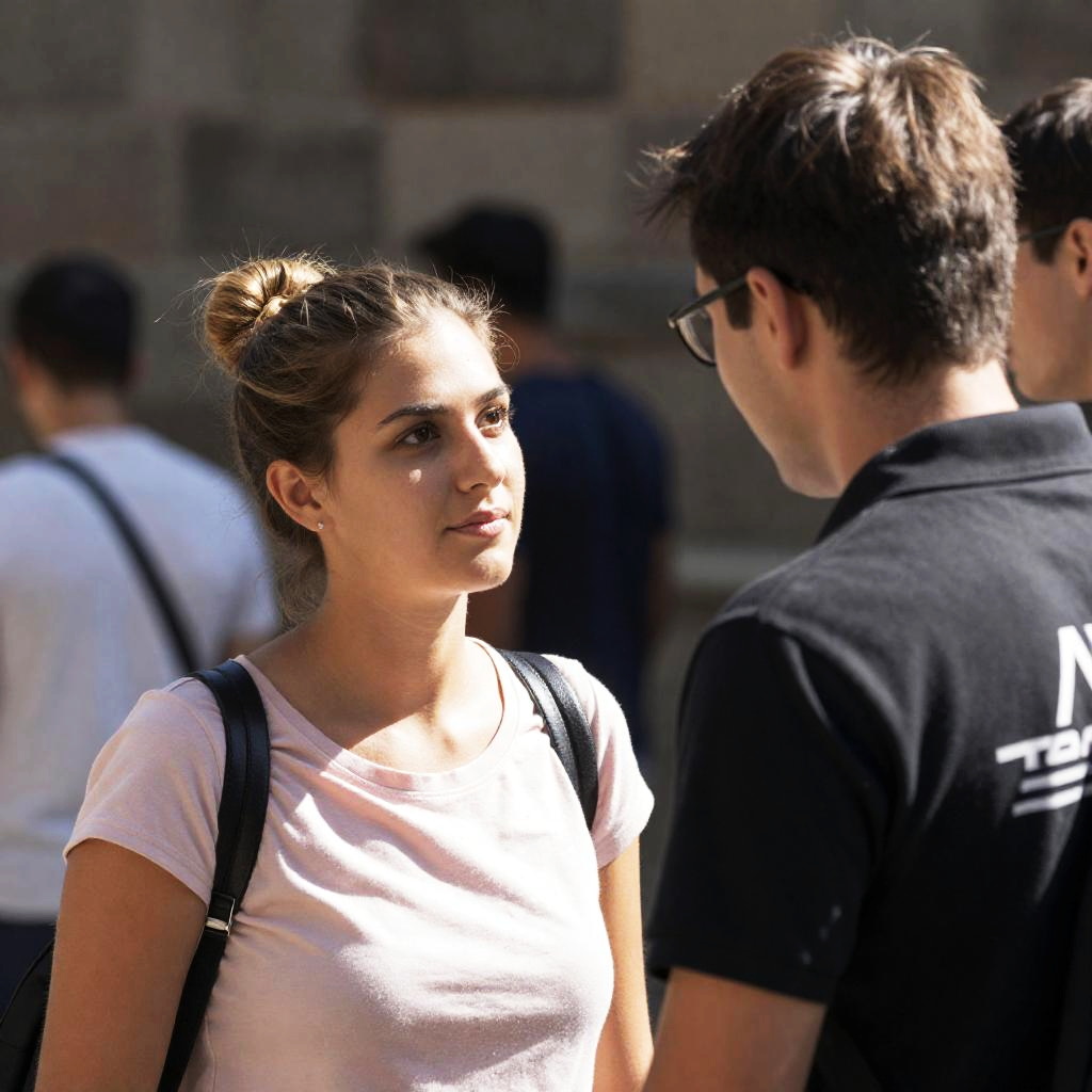 Photograph of a woman with light brown hair in a bun, wearing a pink shirt, looking at a man with short brown hair and glasses, wearing a black polo shirt with white graphics. They are outdoors near a stone wall. Blurred people in the background. Sunlight highlights the woman's face. The man faces her with his back partially turned.