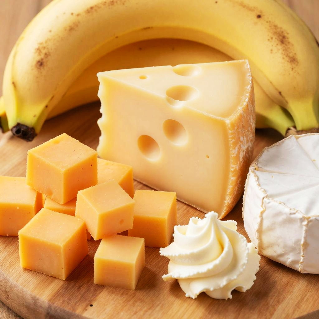 A colorful photo of a wooden cutting board on a red and white checkered tablecloth. It features two brown eggs, a block of yellow cheese, and a nest of yellow fettuccine noodles. There's also a fresh basil leaf on the board. The eggs and cheese are positioned in the top left, while the noodles are to the right. The image has a bright, appetizing feel.