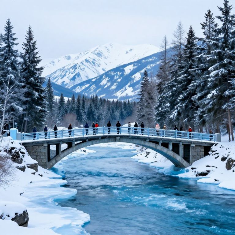 Frozen arches gracefully span a serene river, encasing travelers in icy blue hues as they traverse the natural wonder against a backdrop of snow-capped mountains and evergreen trees.