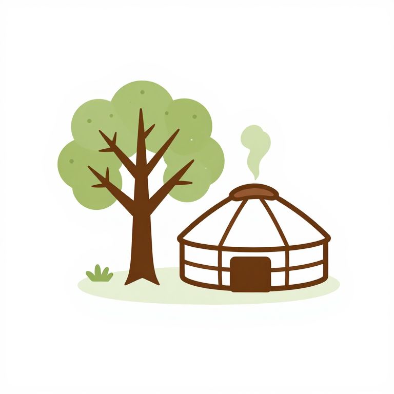 Cartoon-style drawing of a round yurt with a brown door and smoke rising, next to a green-leaved tree on a white background.