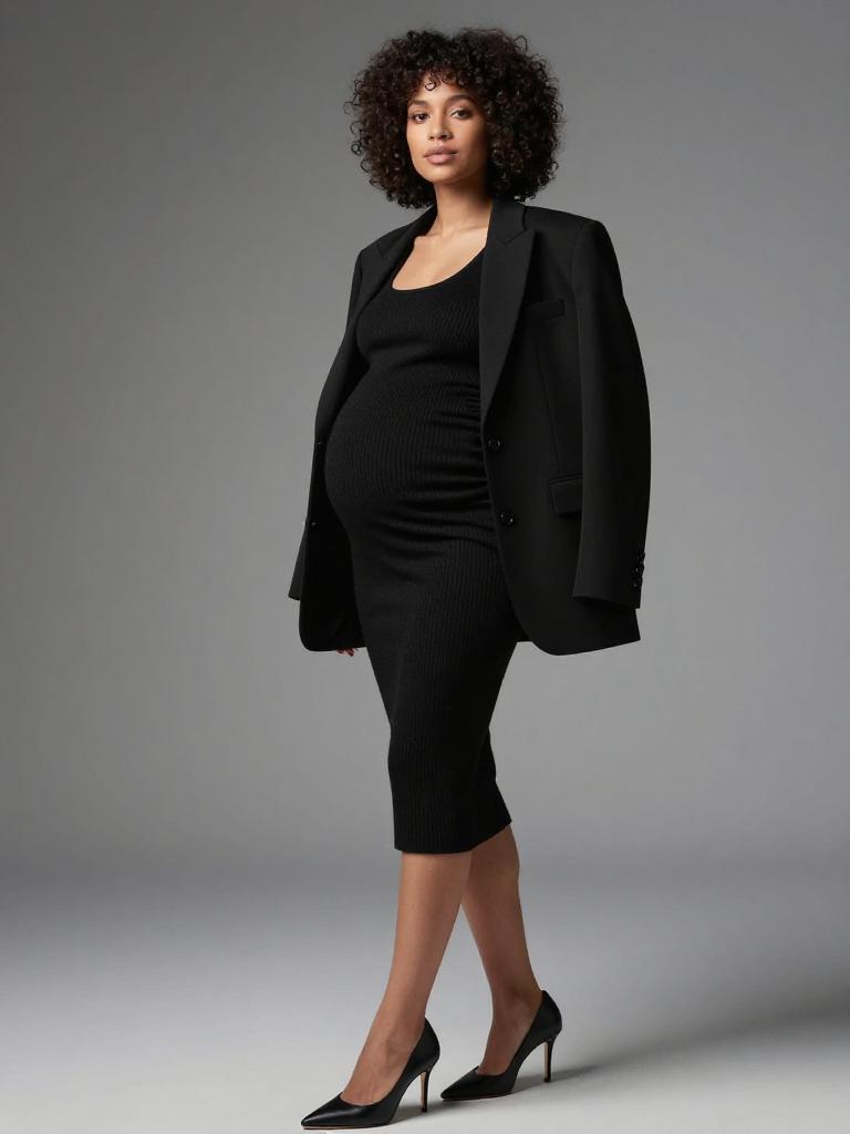 Portrait of a pregnant woman with natural curly afro hair and a curvy athletic build, wearing an all-black sleek monochrome maternity outfit. She is dressed in a soft black knit maternity top with side ruching, a black ribbed knit midi skirt, an oversized black blazer with sharp shoulders, and black kitten-heel pumps. The setting features a soft grey gradient studio background with flattering soft lighting, emphasizing high-end maternity fashion.