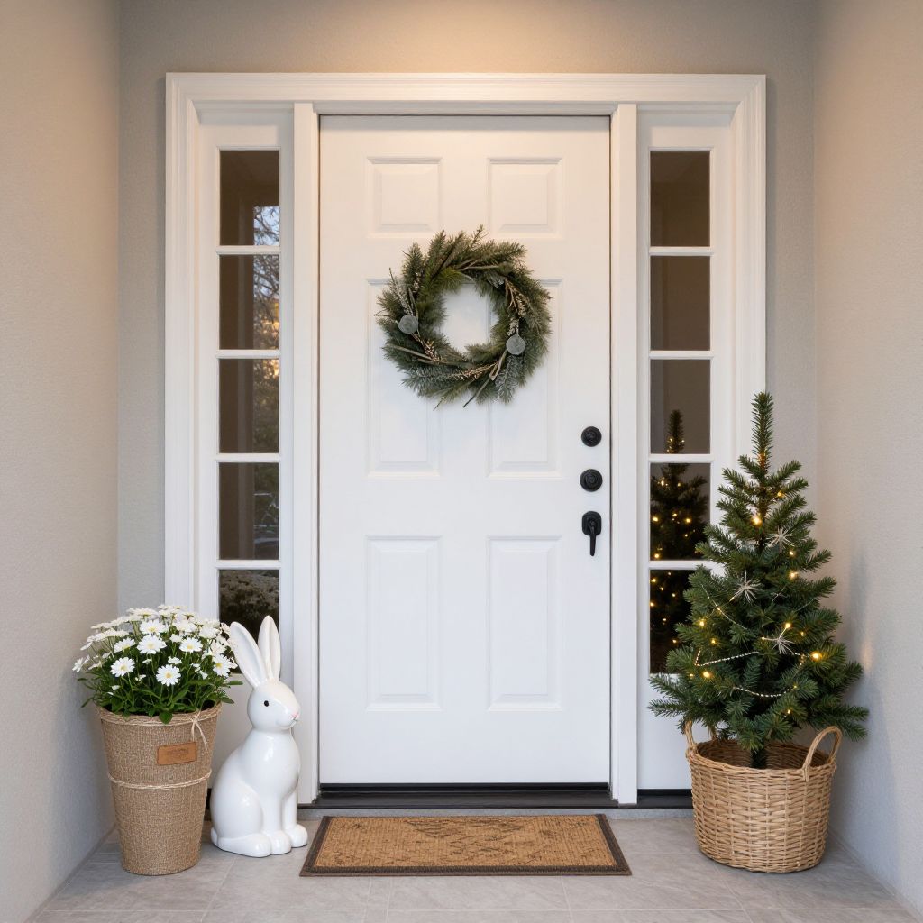 Elegant white front door flanked by two decorative planters—one featuring a burlap container with white flowers and a ceramic Easter bunny, and the other showcasing a lit, miniature Christmas tree in a woven basket—creates a harmonious blend of seasonal decor in a cozy entryway.