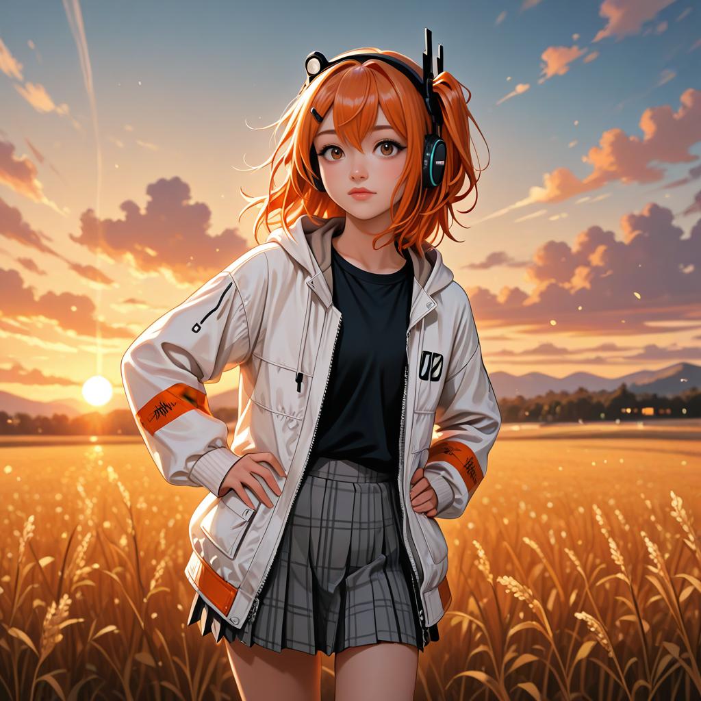Illustration of an anime girl with vibrant orange hair and golden eyes, wearing a white and orange jacket, black turtleneck, grey pleated skirt, and black leggings. She has a headset with a microphone and stands confidently on a rural road during sunset with golden light and fields in the background.