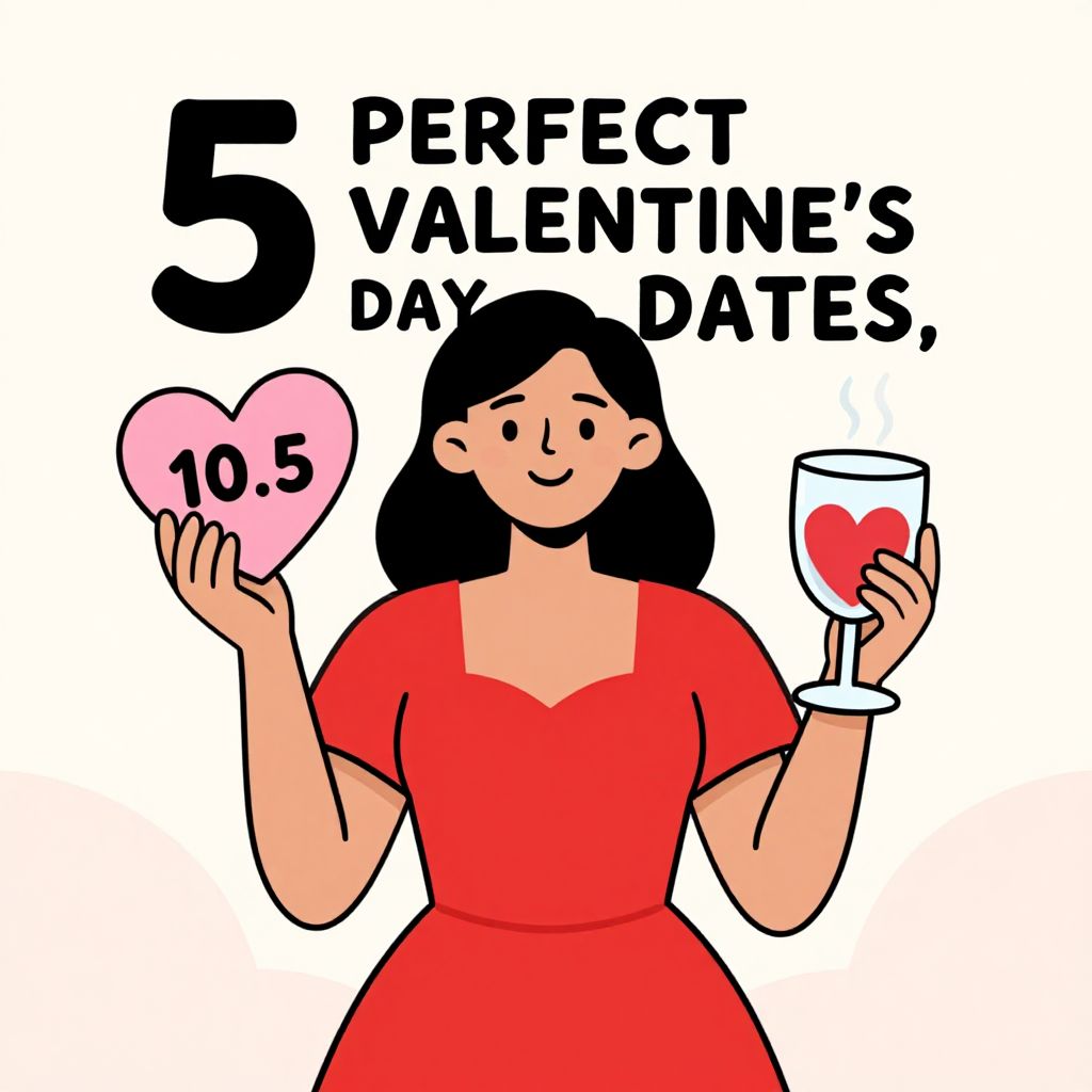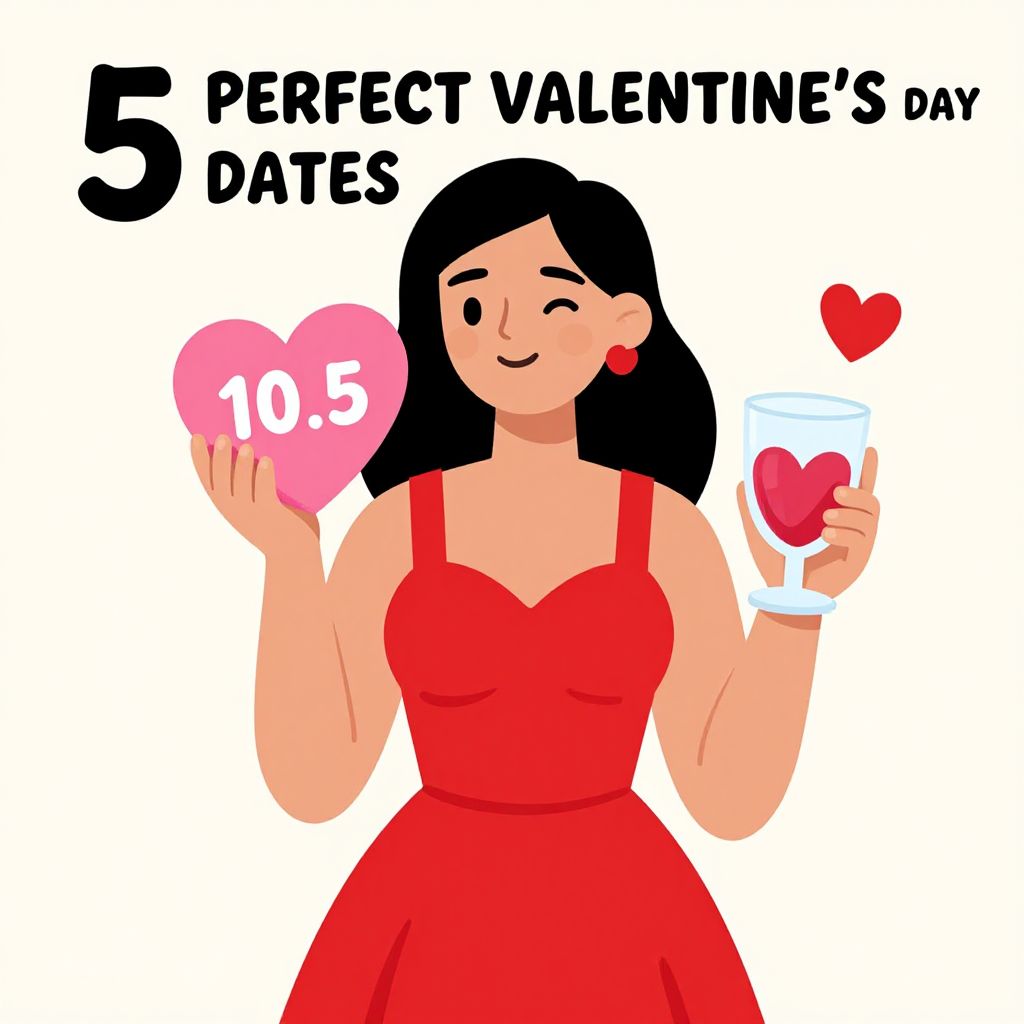 A vibrant cartoon-style illustration featuring a woman in a red dress holding a pink heart-shaped object labeled \"10.5\" and a glass with a heart design, set against a minimalist background with text reading \"5 PERFECT VALENTINE'S DAY DATES,\" evoking a playful and romantic theme.
