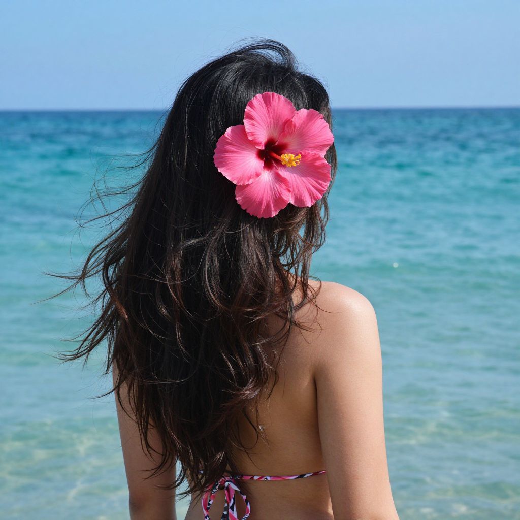 Photograph of a woman with long black hair, a pink hibiscus flower in her hair, facing a turquoise ocean, wearing a bikini,