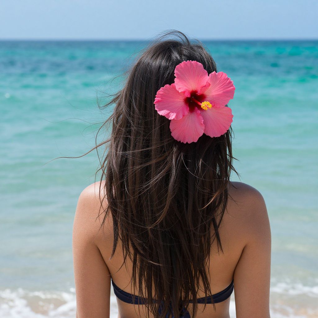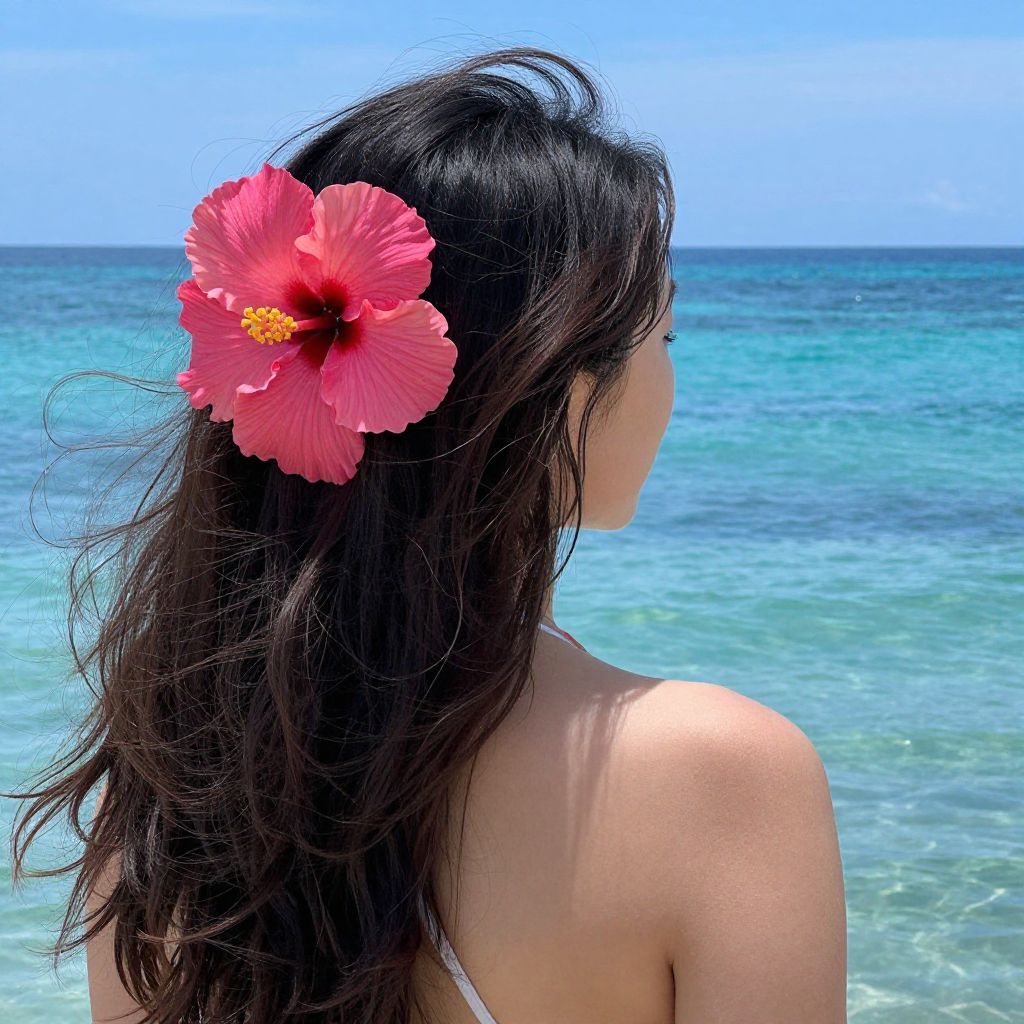 Woman with a vibrant pink hibiscus flower tucked into her dark, flowing hair stands facing the turquoise sea, her back turned to the camera as she enjoys the serene beach setting.