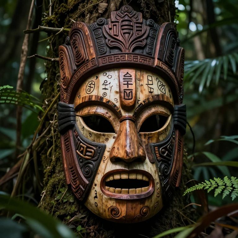 Mask concept art showcasing tribal influences with ornate carvings, natural materials like wood and bone, deep earthy tones, surrounded by dense jungle environment, mystical symbols glowing faintly on the mask's surface, evoking ancient warrior spirits.