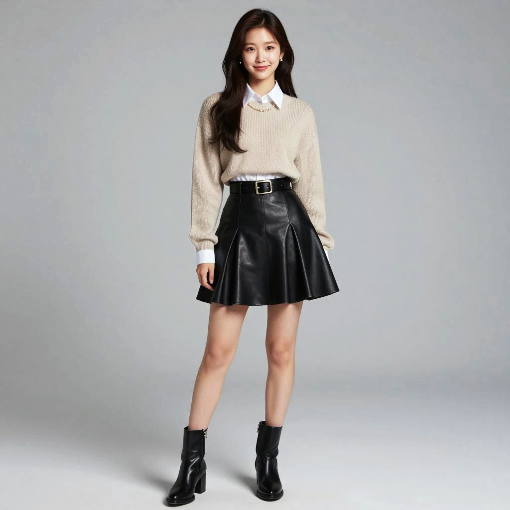 ((best_quality, high_resolution, distimct_image)), ultra_realistic details, sharp focus, detailed skin, full body, (21years old pretty korean girl:1.2), (kpop idol:1.2)(, korean beauty:0.8), (korean mixed), 1girl, shy smile, Cropped collared shirt worn with a high-waisted leather flared skirt and statement ankle boots., Striped collared shirt layered under a knit sweater, paired with a faux leather flared skirt and ankle boots., Classic Chic: A white collared shirt tucked into a black flared skirt. Accessorize with a wide belt and pearl jewelry for a timeless and sophisticated ensemble., (indoor studio background)