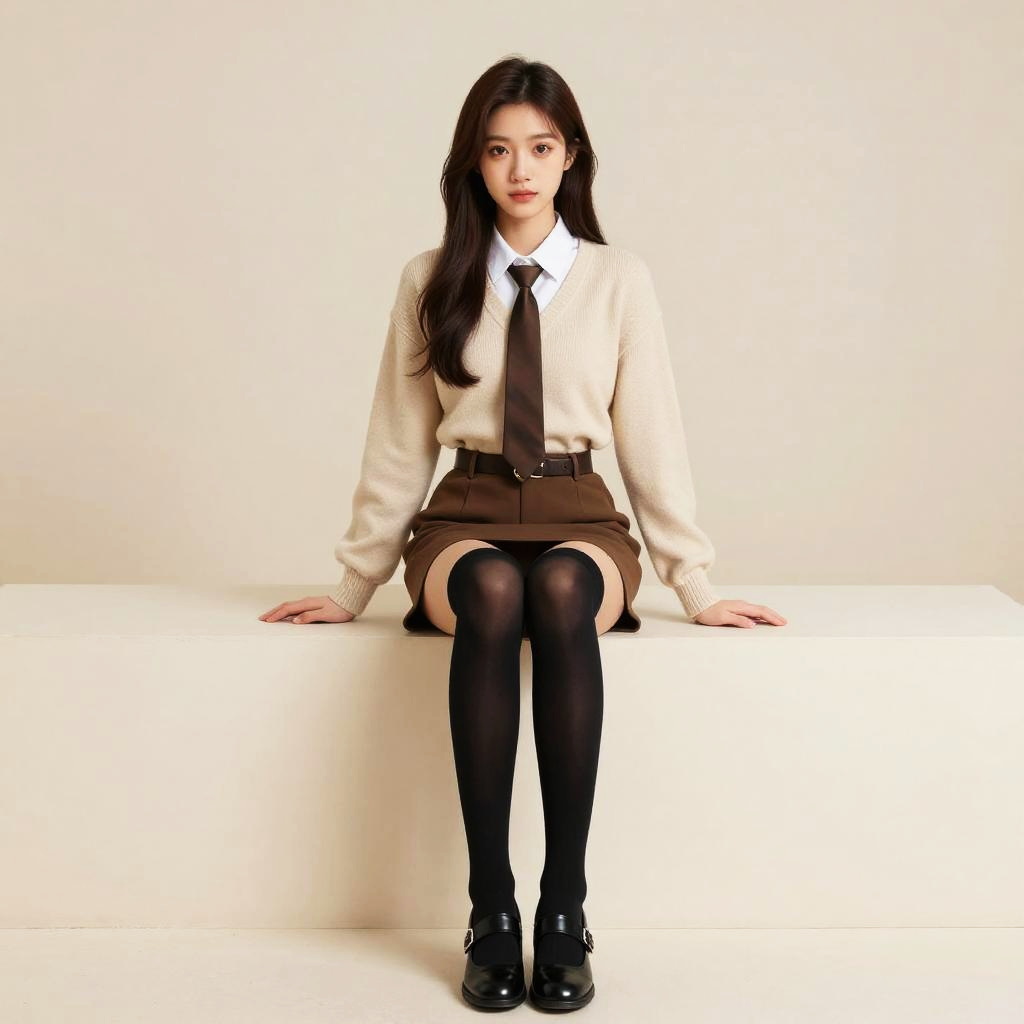 Photograph of an Asian woman with long black hair, wearing a cream knit sweater, white collar shirt, black leather skirt, and black ankle boots,