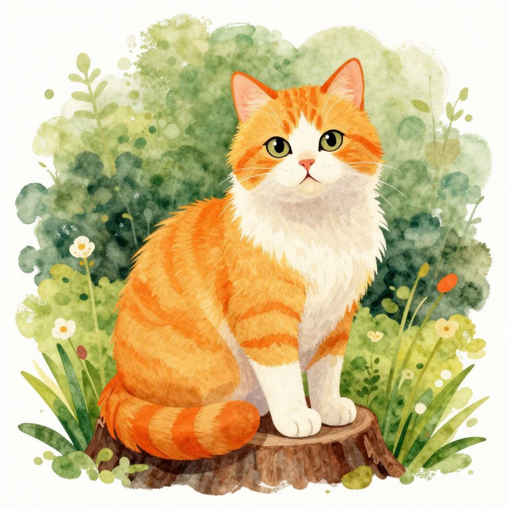 The image is a vibrant watercolor illustration of a cat, reminiscent of a children's book style, by Thomas Moran. The cat, with its fluffy orange and white fur, sits gracefully on a tree stump, surrounded by a lush, green, and slightly blurred background that suggests a natural, outdoor setting. The cat's expression is serene and contemplative, with its gaze directed slightly to the side, adding a sense of curiosity and tranquility to the scene. The use of bright, cheerful colors, such as the warm oranges and yellows of the cat's fur and the soft greens of the background, creates a joyful and whimsical atmosphere. The plain white background enhances the focus on the cat and the natural elements, making them stand out vividly. The overall composition is balanced, with the cat positioned centrally, and the tree stump and grasses providing a grounding element that frames the subject beautifully. The interplay of colors, textures, and shapes in the illustration contributes to a harmonious and engaging visual experience.