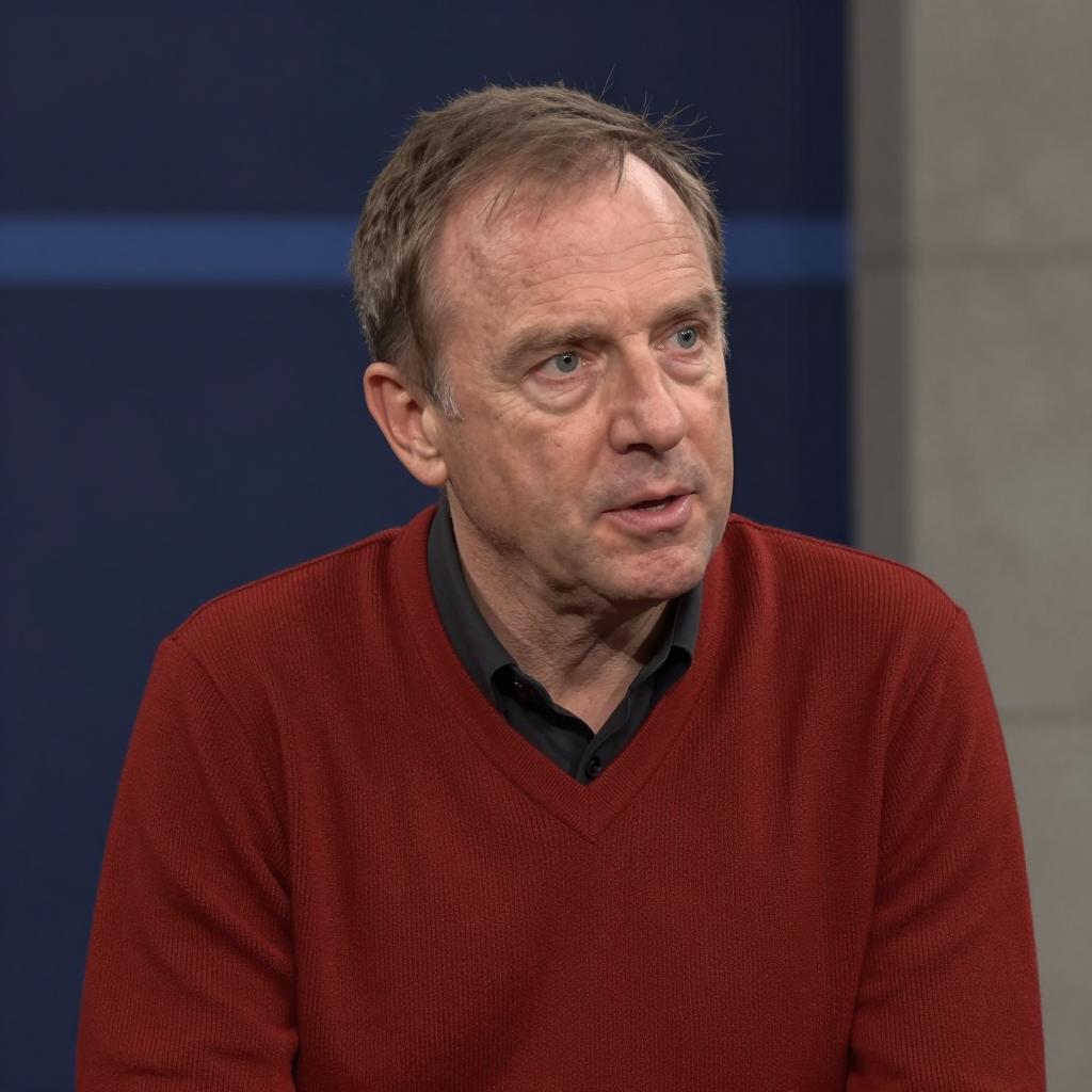 A middle-aged man with light skin, short brown hair, and blue eyes, wearing a red ribbed shirt over a black collared shirt. He sits with a slightly open mouth, looking to the right. Dark blue background with blurred horizontal lines and a concrete pillar on the right.