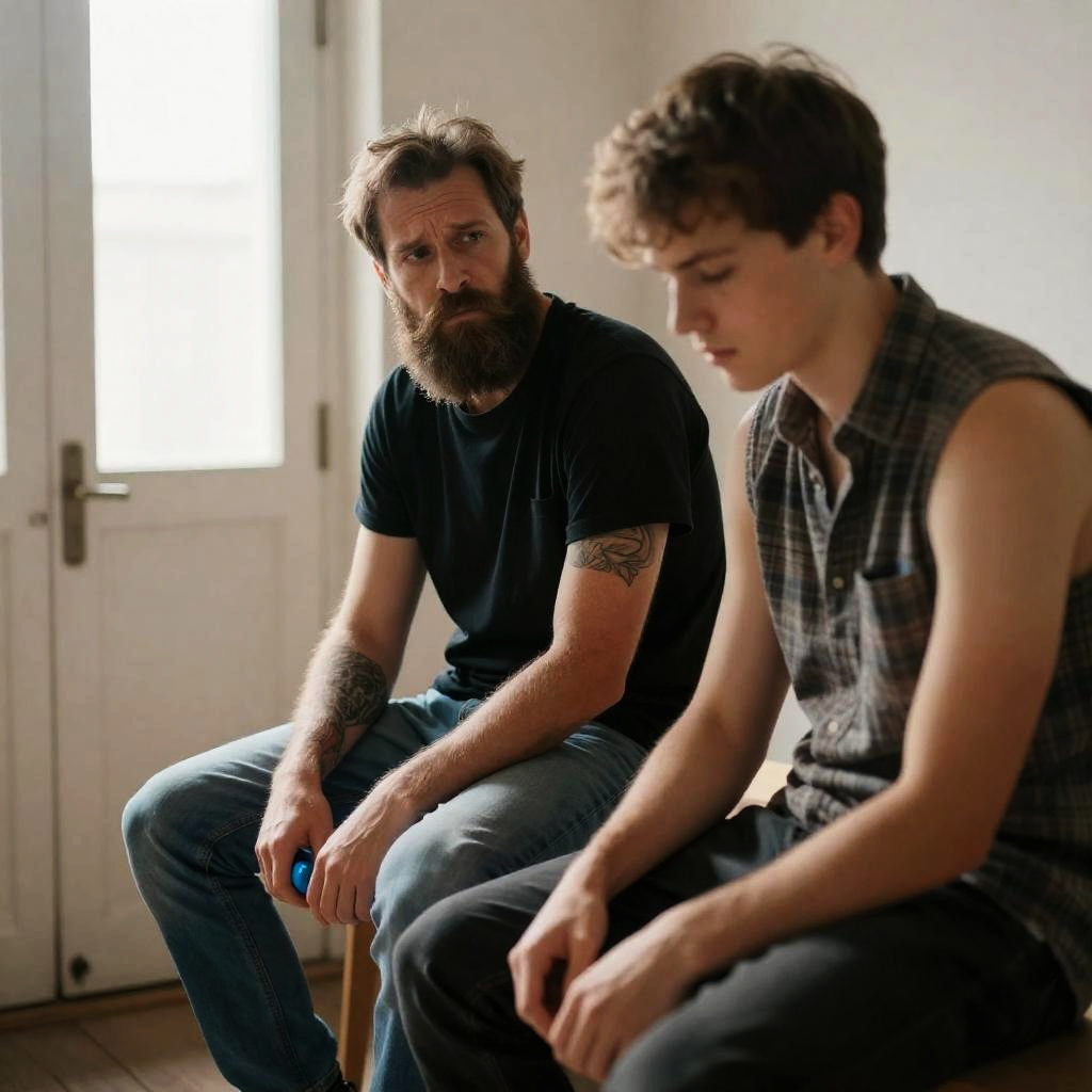 Photograph of two shirtless men sitting at a cluttered table. The older man with curly dark hair and a beard, left, holds the younger man's hands. The younger man with blonde hair, right, looks at the older man. Both have tattoos on their arms. A yellow bottle is on the table. Background includes shelves and household items.