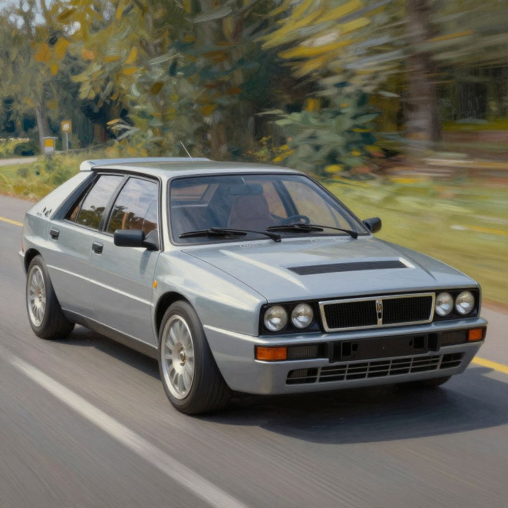 Art deco, a super sports car, lancia delta integrale, modern car, current, masterpiece, highly artistic, high definition, realistic, 4k, hyper detailed, (impressionist gouache oil on canvas painting:1.25), best quality, high resolution, 8k . award-winning, professional, highly detailed