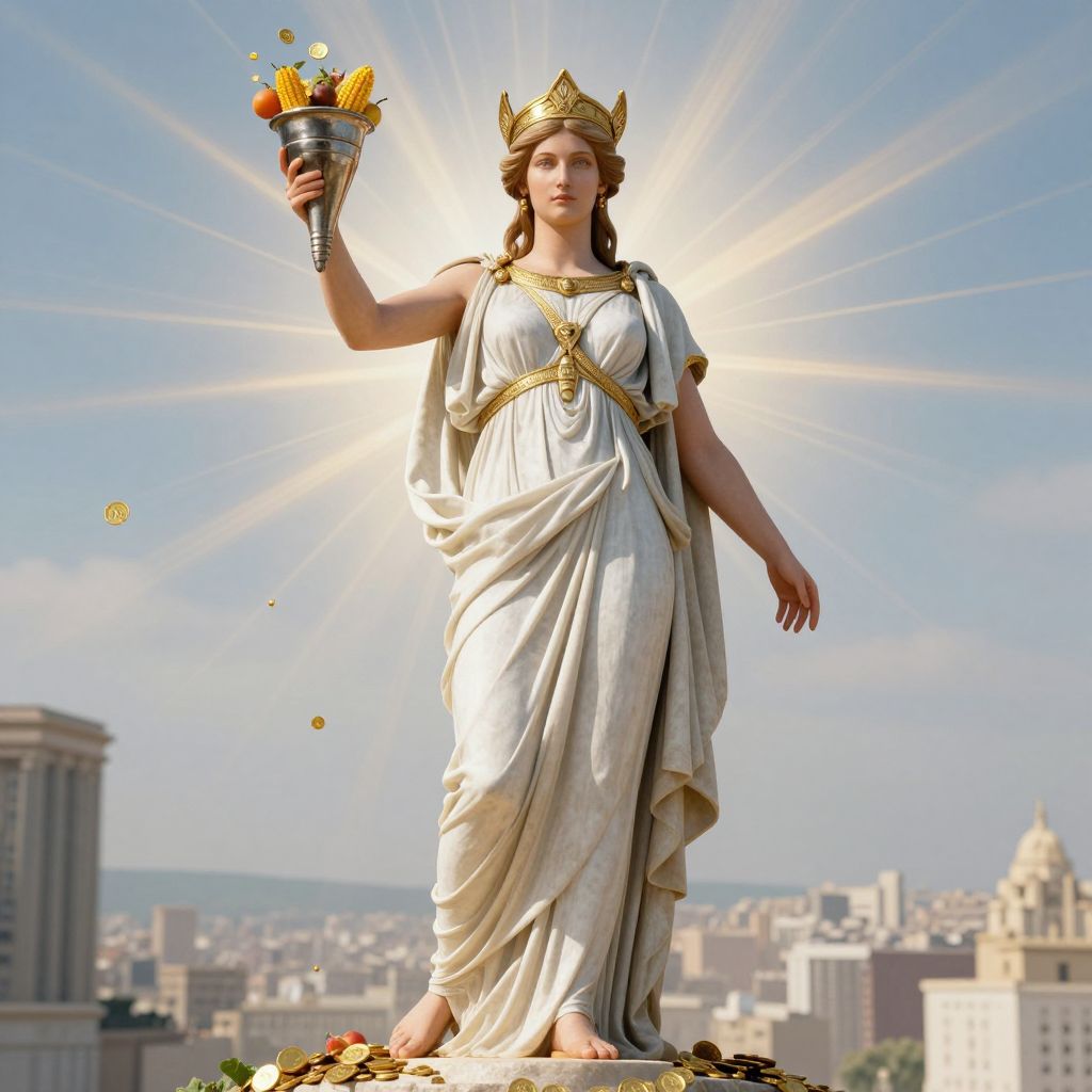 A majestic statue of Tyche, the ancient Greek goddess of fortune and luck, depicted as a regal woman wearing flowing robes and a golden crown. She holds a cornucopia filled with golden coins and fruits. The statue stands against a cityscape backdrop with radiant light beams, highlighting a mythological and ethereal atmosphere.